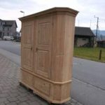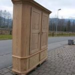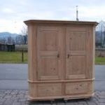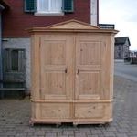 Sehr schöner, einfacher, 4 - teiliger Schrank mit 2 Sockelschubladen. In jeder Türe, welche auf Messingbändern laufen sind 2 gestochene Füllungen. Für den Transport lässt sich der Sockelteil und der Schrankteil auseinandernehmen.rnDie Rückwand wurde verbreitert und die Schlösser ersetzt.rnHöhe 202 cm ist ohne den Eckaufsatz und evt auf Wunsch zu montierende Füsse gemessen.