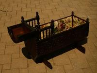 Eignet sich kaum für ein Kleinkind, stammt laut eingeschnitzter Jahreszahl von 1622 und ist in einem Topp Zustand. Der Innenraum ist gepolstert ausgekleidet, der Kopfteil lässt sich auf- bzw. zuklappen