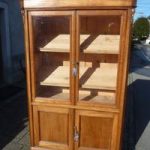 Furnierte, alte Vitrine mit Tablaren lt. Foto. Ein Glas hat einen kleinen Riss über die Ecke, welchen man kaum beachtet.