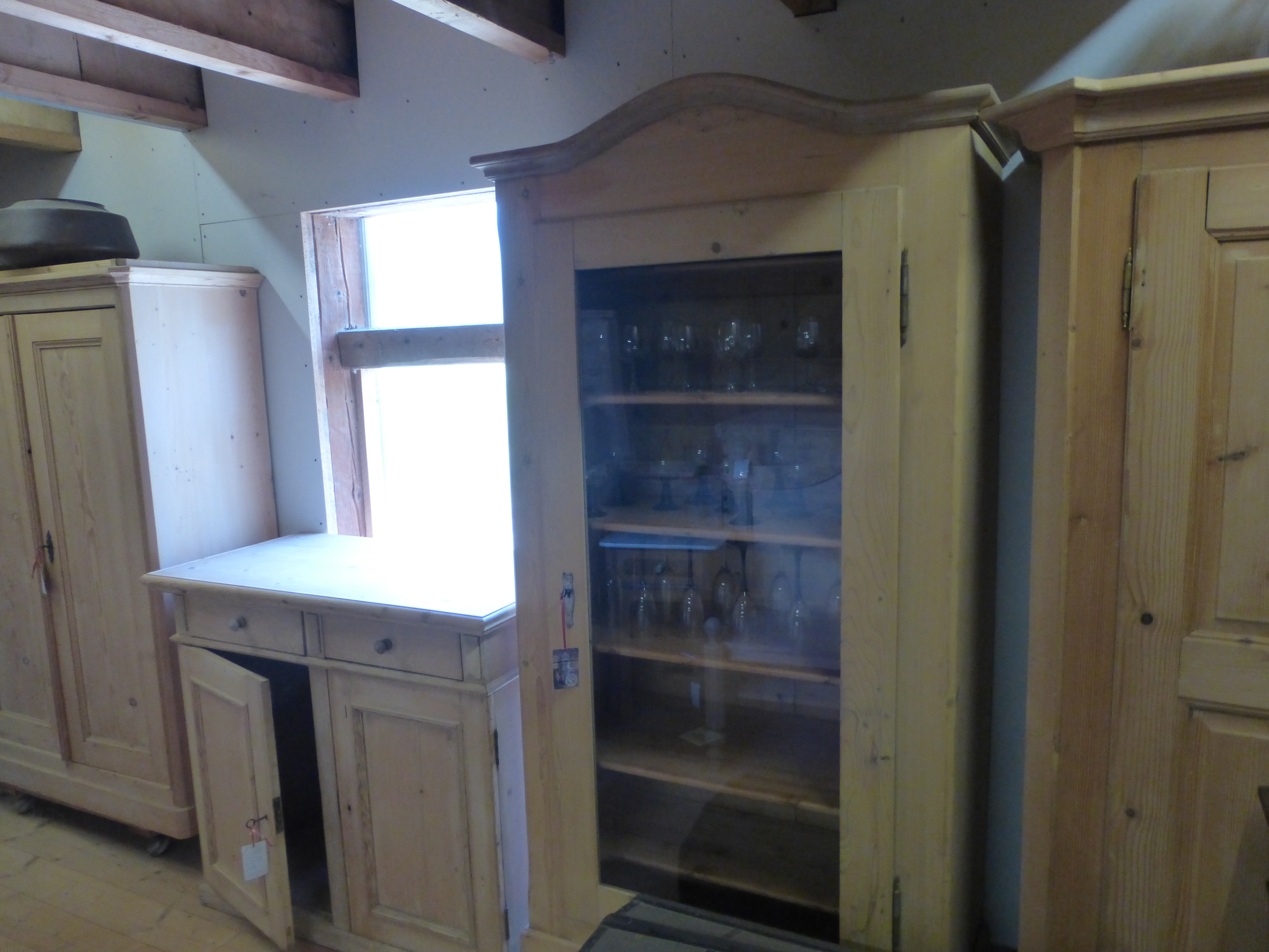 Türfüllung eines alten, gelaugten Schrankes mit starkem Glas ersetzt und Tablare montiert. Leider habe ich hier im Büro nur ein schlechtes Bild zur Hand.
