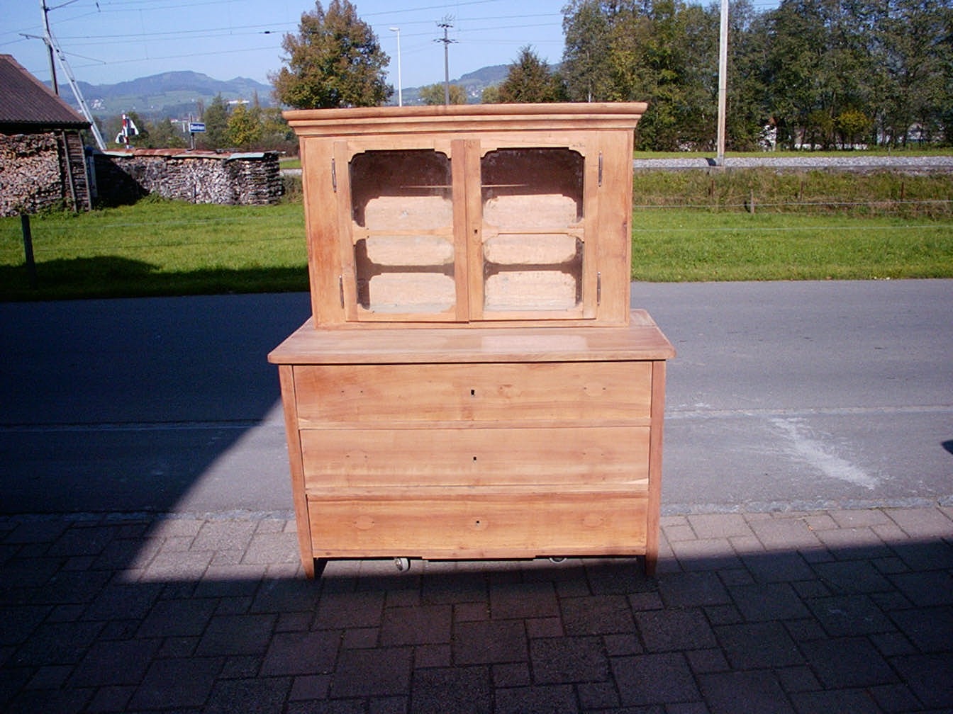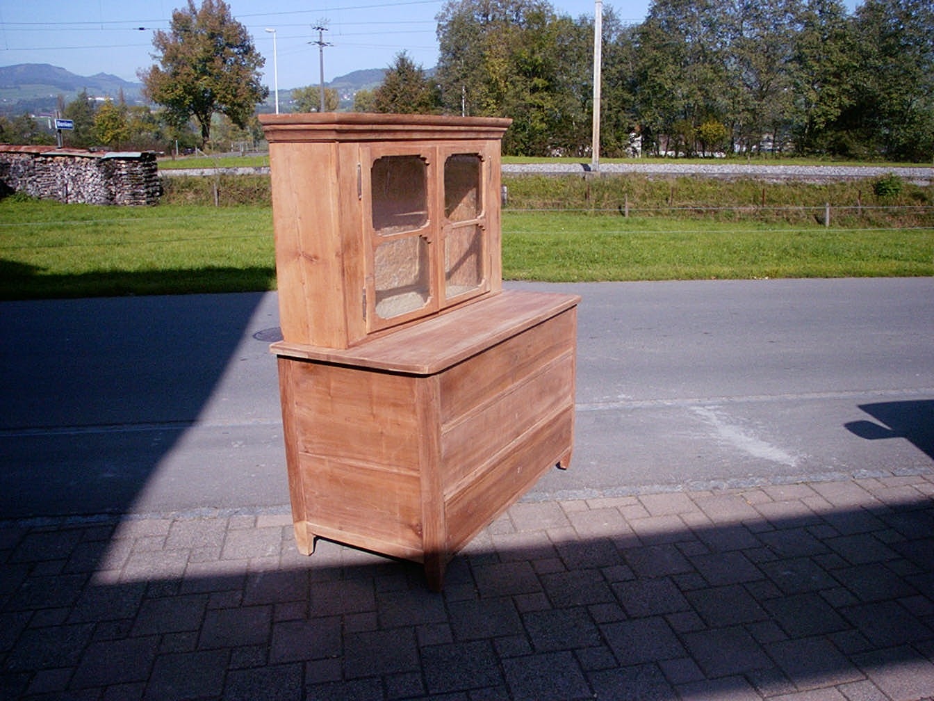 Diese Kirschbaumvitrine steht hier im Bild auf einer passenden Kirschbaumkommode Nr. 1588. Beides ist für die Endbearbeitung vorbereitet.