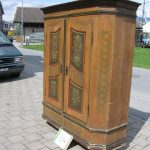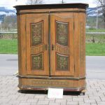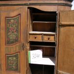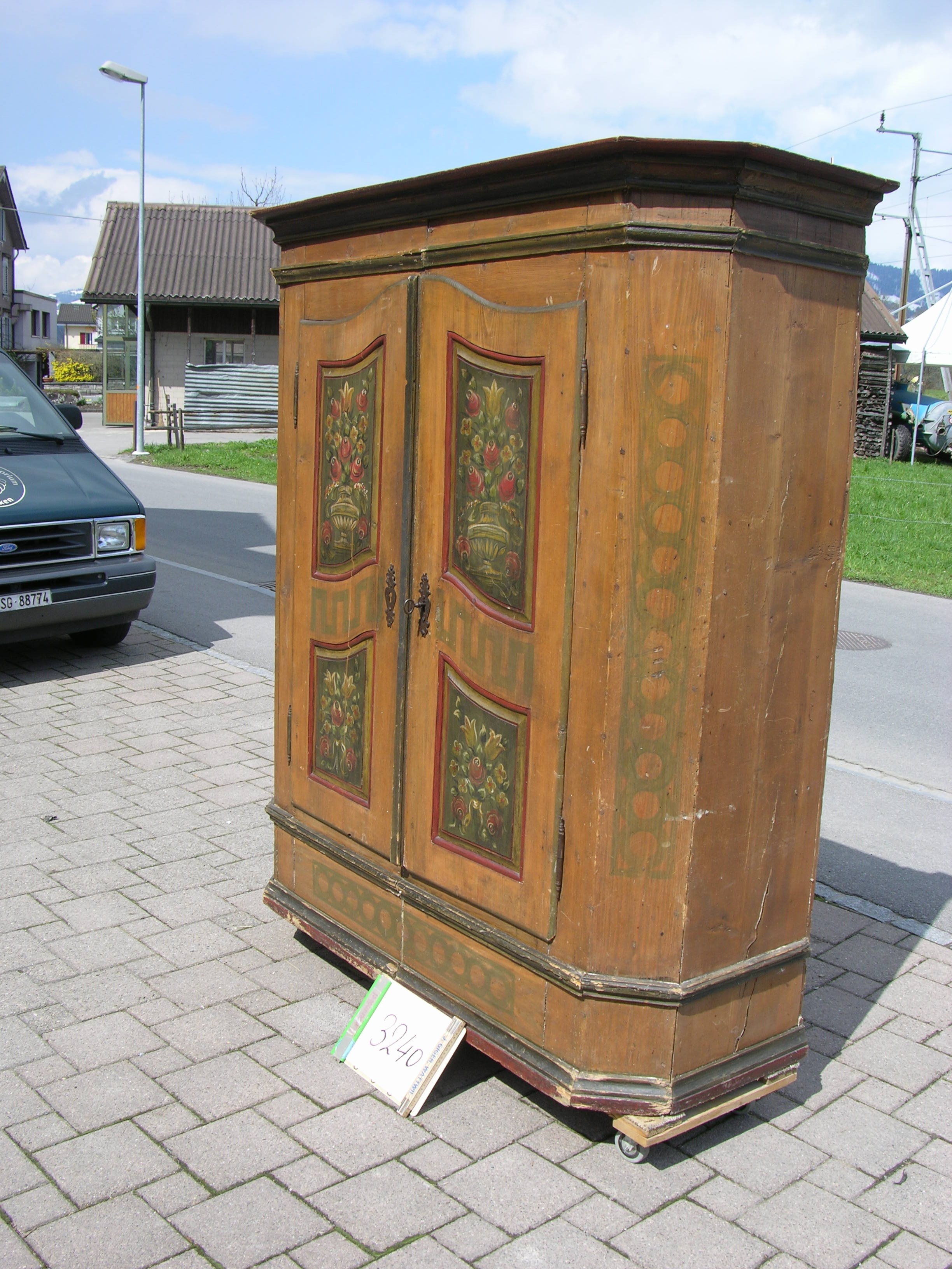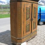 alter, bemalter Bauernschrank mit den beliebten, abgeschrägten Seiten. Für den Transport einfach zu teilen.
