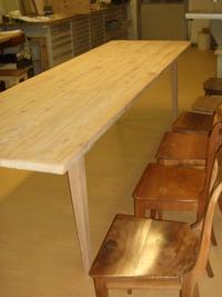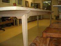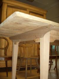 Blatt ist demontabel an den Gratleisten mit Zapfen fixiert. Der Tisch hat vermachte Wurmschäden, jeder Ast macht einen Buckel. Die Platte sieht aus, wie wenn sie über hundert Jahre täglich x mal gereinigt und gebraucht wurde, ist aber aus sehr alten Bodenbrettern neu gefertigt worden.