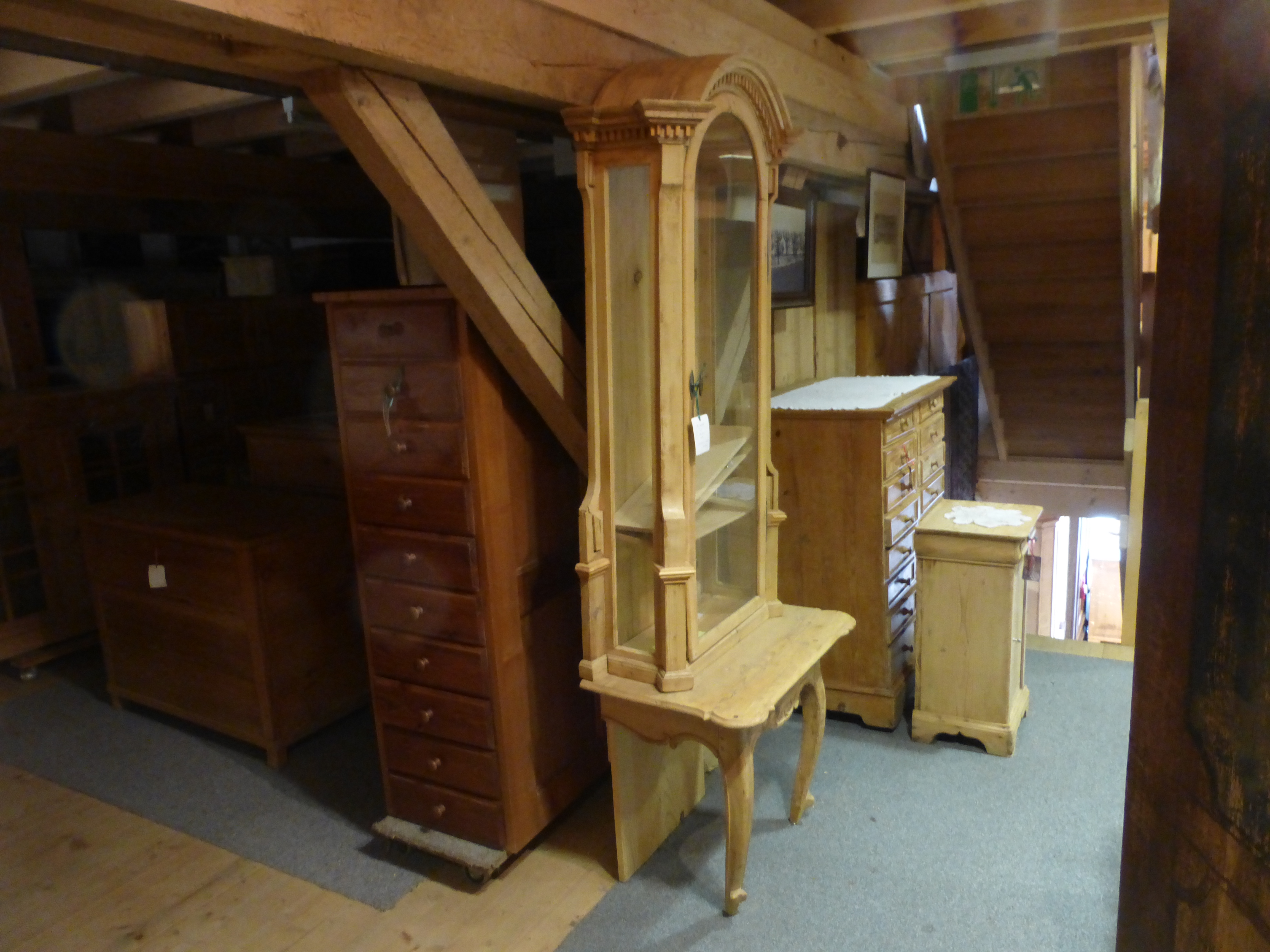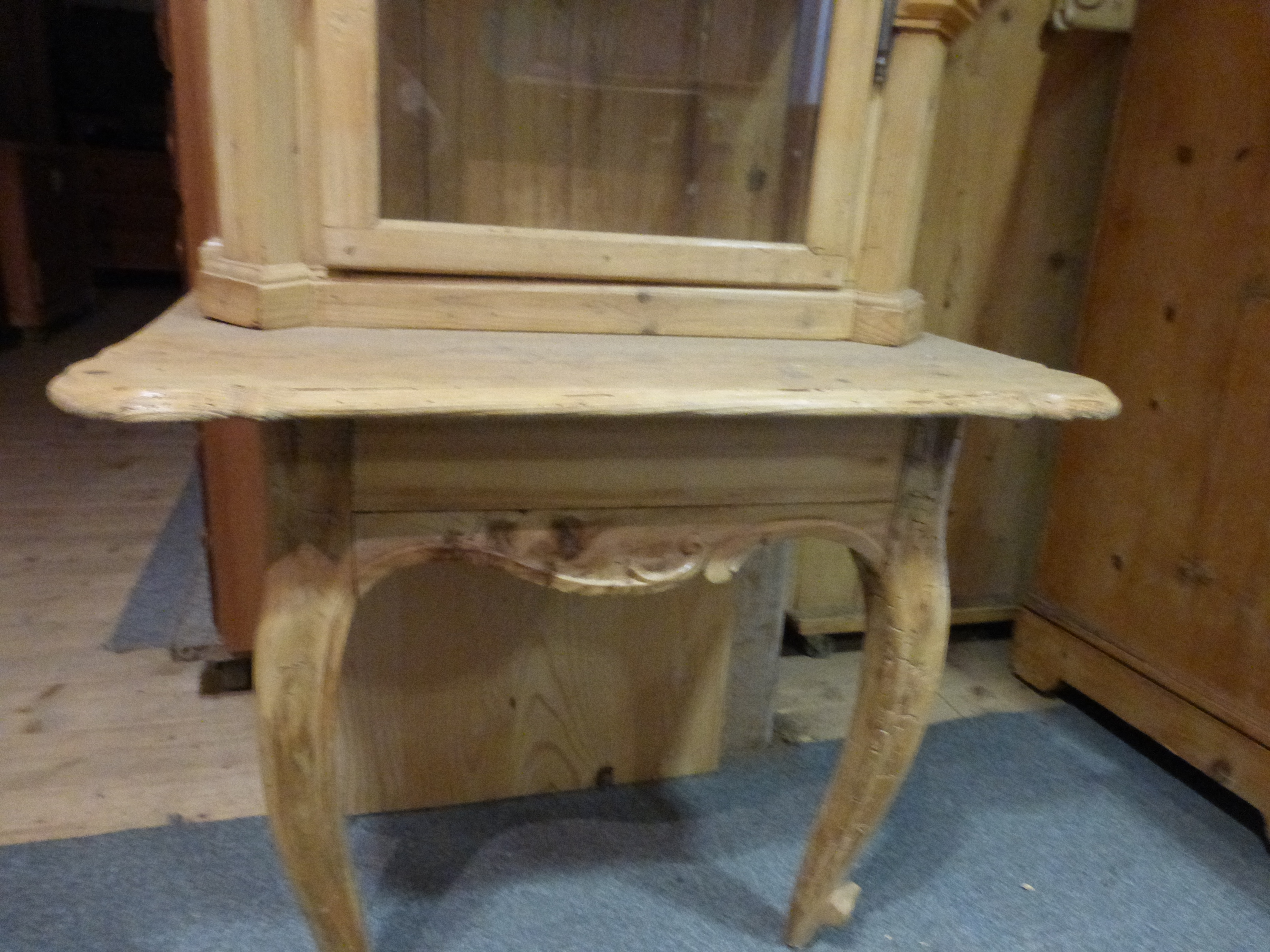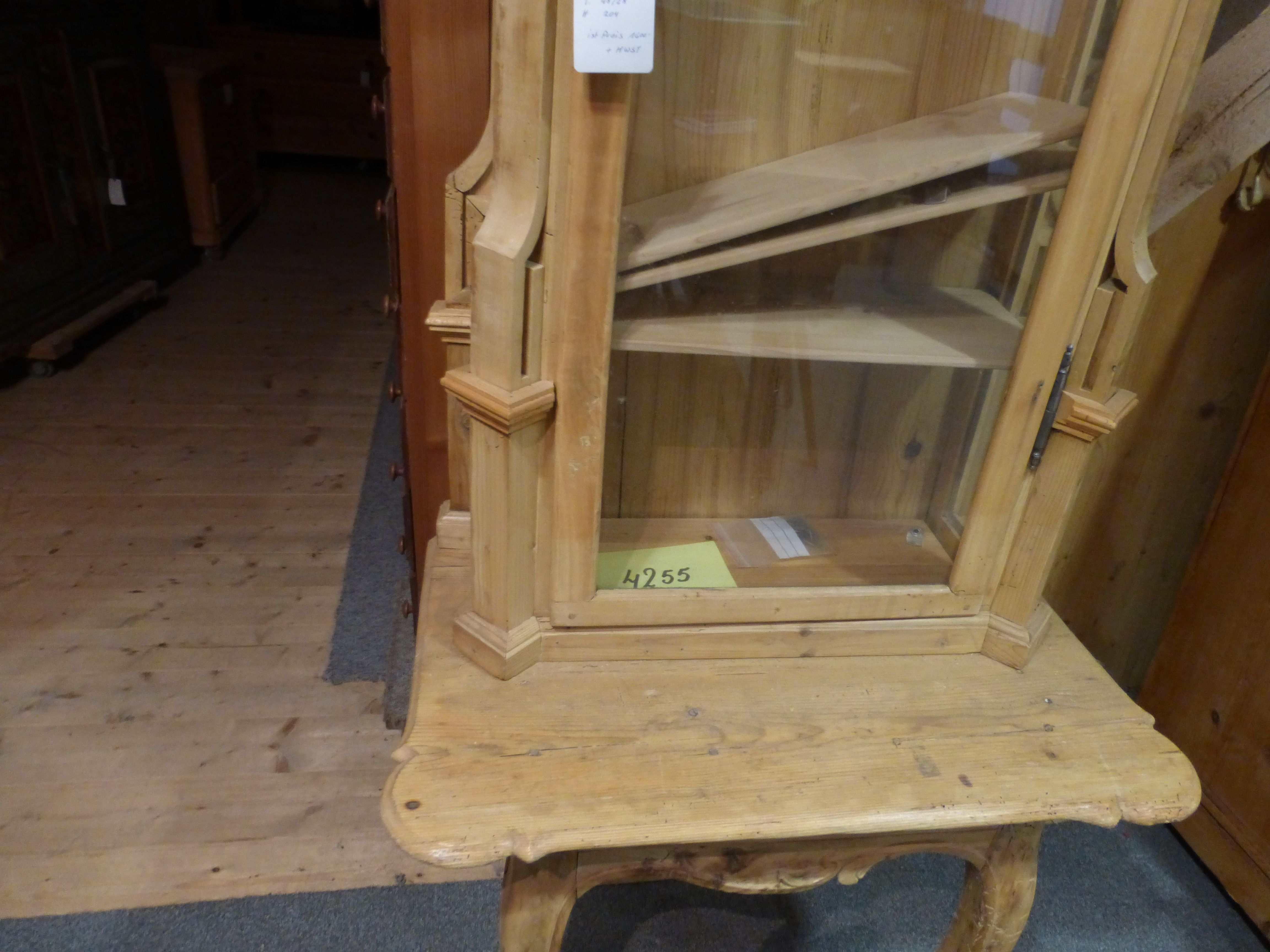Vitrine, worin in einem Kloster eine Gipsmadonna stand. Muss an einer Wand stehen, da es nur die Vorderbeine gibt. Es können Tablare montiert werden. Die Einzelteile können aber auch separat genutzt werden.