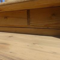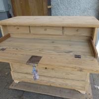 Die Front der obersten Schublade lässt sich abklappen und gibt weitere Schubladen frei. Gelaugt, repariert und für die gewünschte Endbearbeitung vorbereitet.