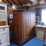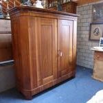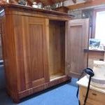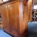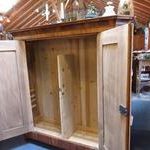 Teilmassiver Nussbaumschrank, zerlegbar mit stark geschrägten Seiten. Das Innenleben ist nur teilweise geeignet. Um eine schöne Gestaltung zu bewirken, würde ich vorschlagen, den ganzen Innenausbau entsprechend dem Verwendungszweck neu zu fertigen. Der Schrank ist ein mal geölt worden und wird nach dem Verkauf fertig behandelt.