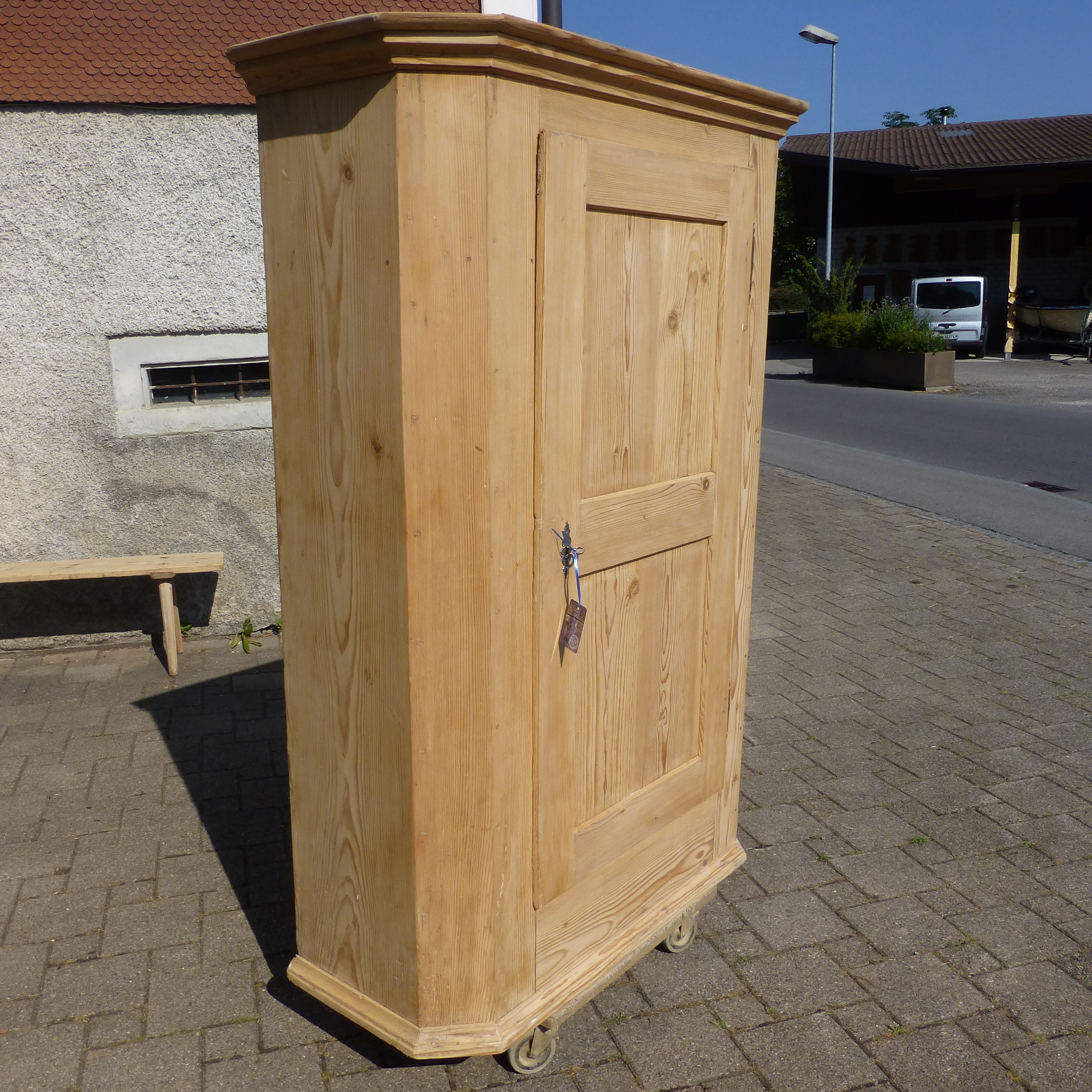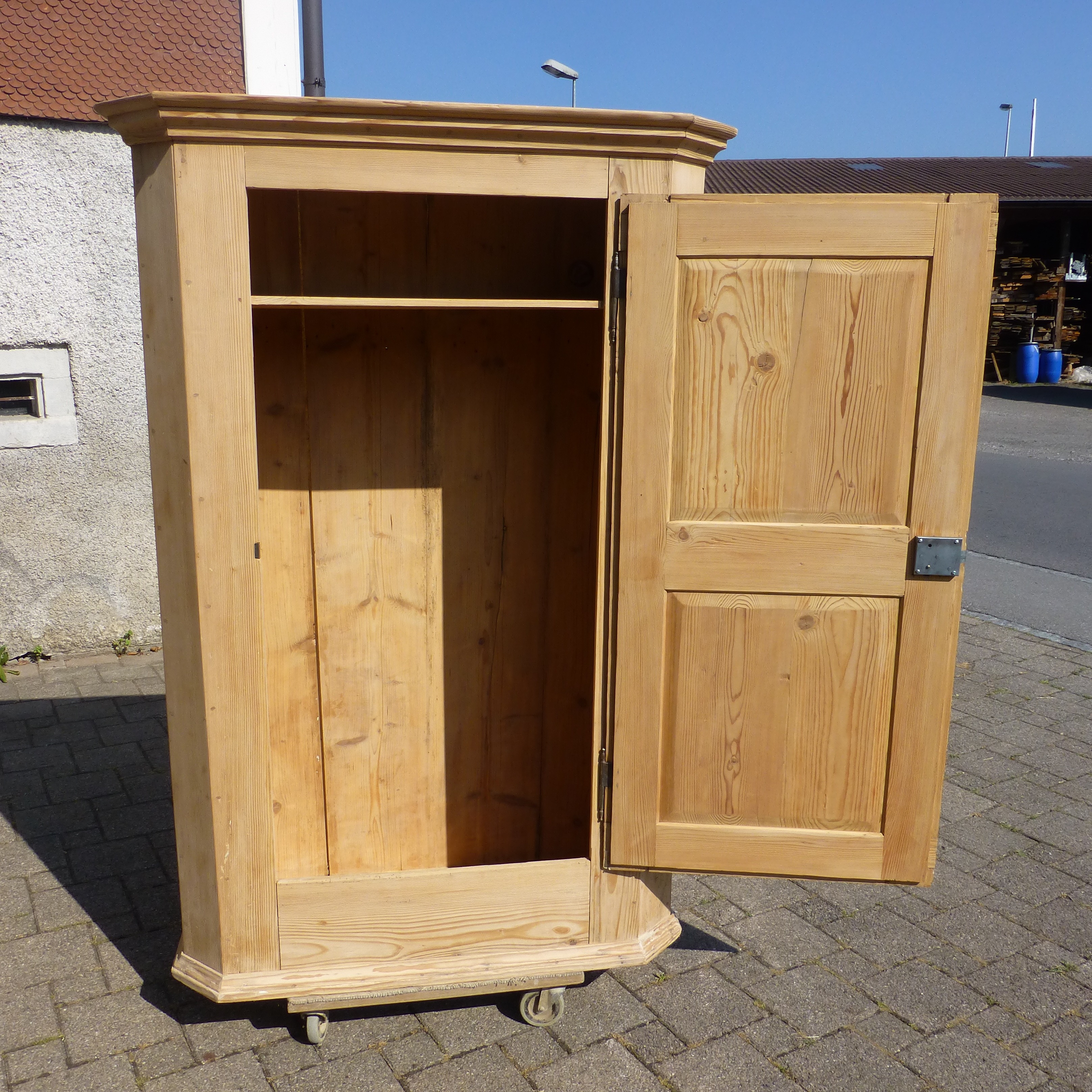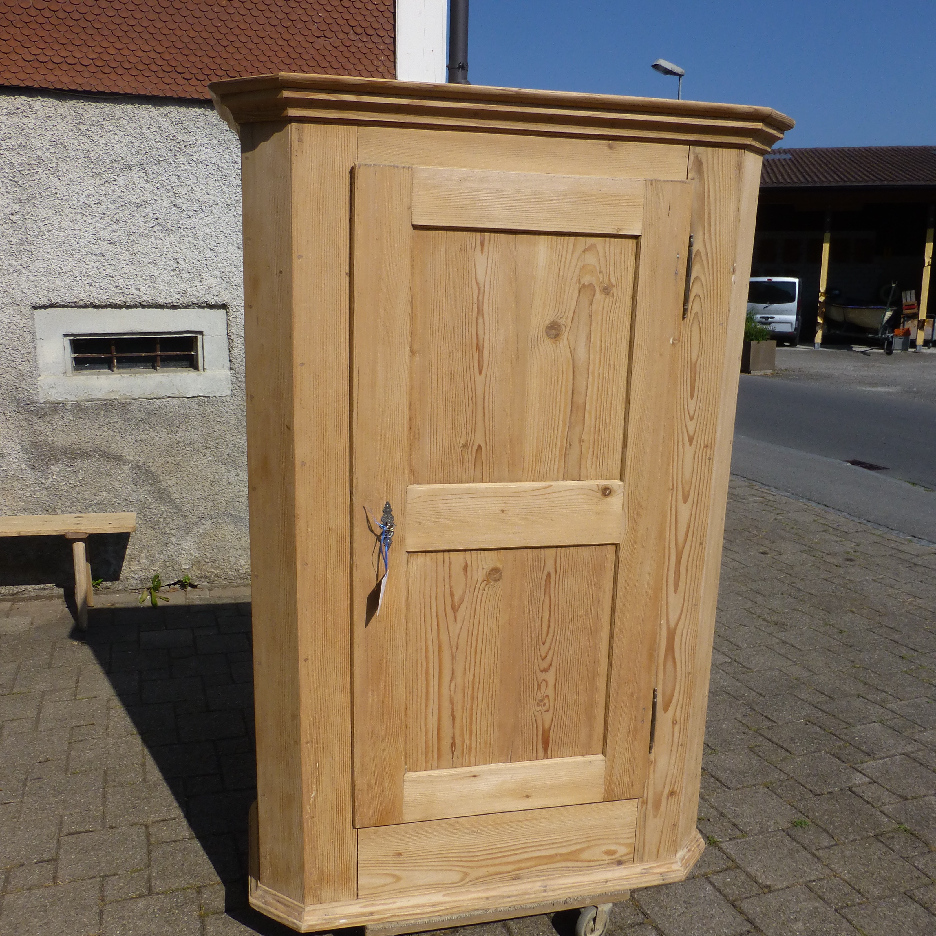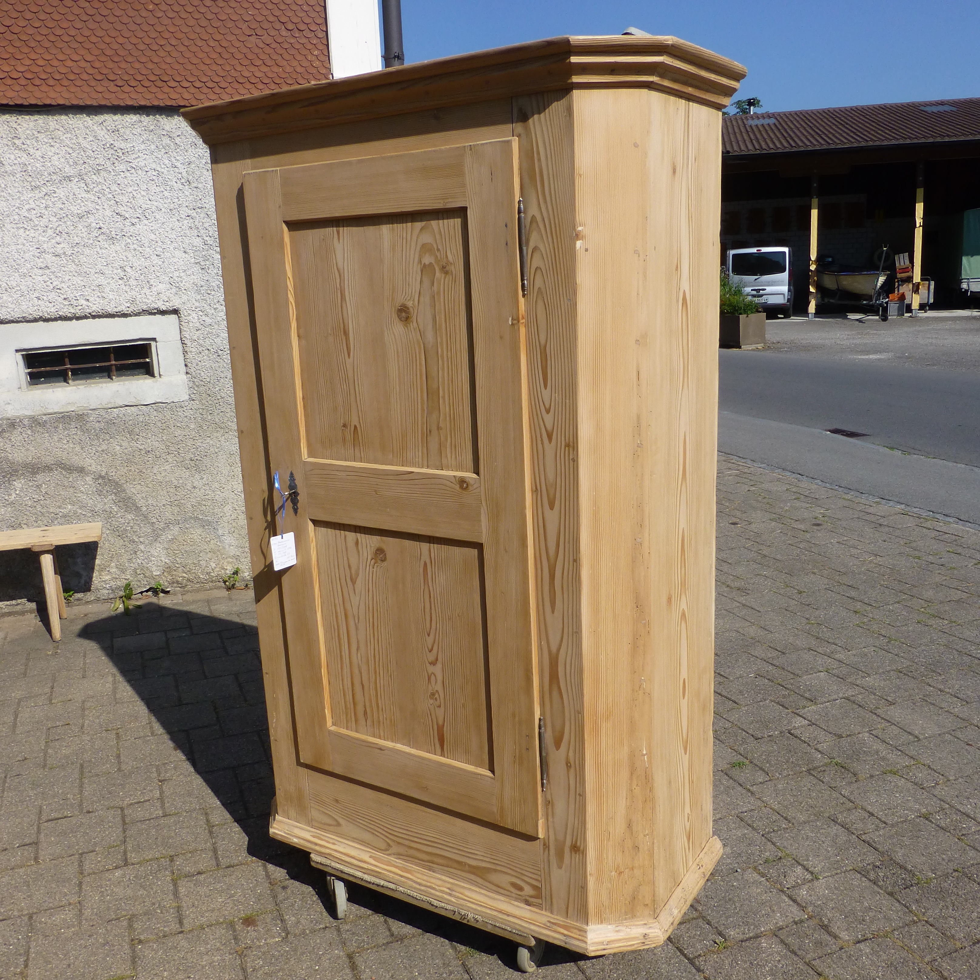 Sehr gut erhaltener Bauernschrank mit geschrägten Seiten. Der Schrank wurde abgelaugt, neutralisiert und in der Trocknungskammer auf 6 % Hf. getrocknet, danach repariert und vorgeschliffen.