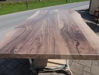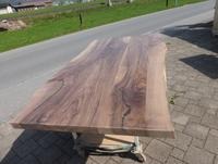Bei uns im Lager stehen meist um die 80 Tischplatten oder Tischblätter in verschiedenen Grössen zur Auswahl bereit. Die Unterbauten werden in kurzer Zeit wunschgemäss und passend gefertigt. Dasselbe gilt für die Plattenstabilisation mittels Gratleisten und der Oberflächenbehandlung. Die abgebildete Nussplatte hat untenstehende Masse: