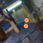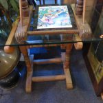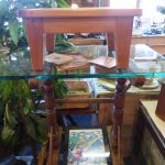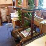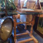 Ess sind 2 fast gleiche Tische aus dem gleichen Landsitz - Haushalt hier. Nr. 4982 und Nr. 4983 Dicke Glasplatte mit geschliffenen Rändern auf altbäuerisch gedrechseltem Holzgestell. Recht simpatische Kombination.