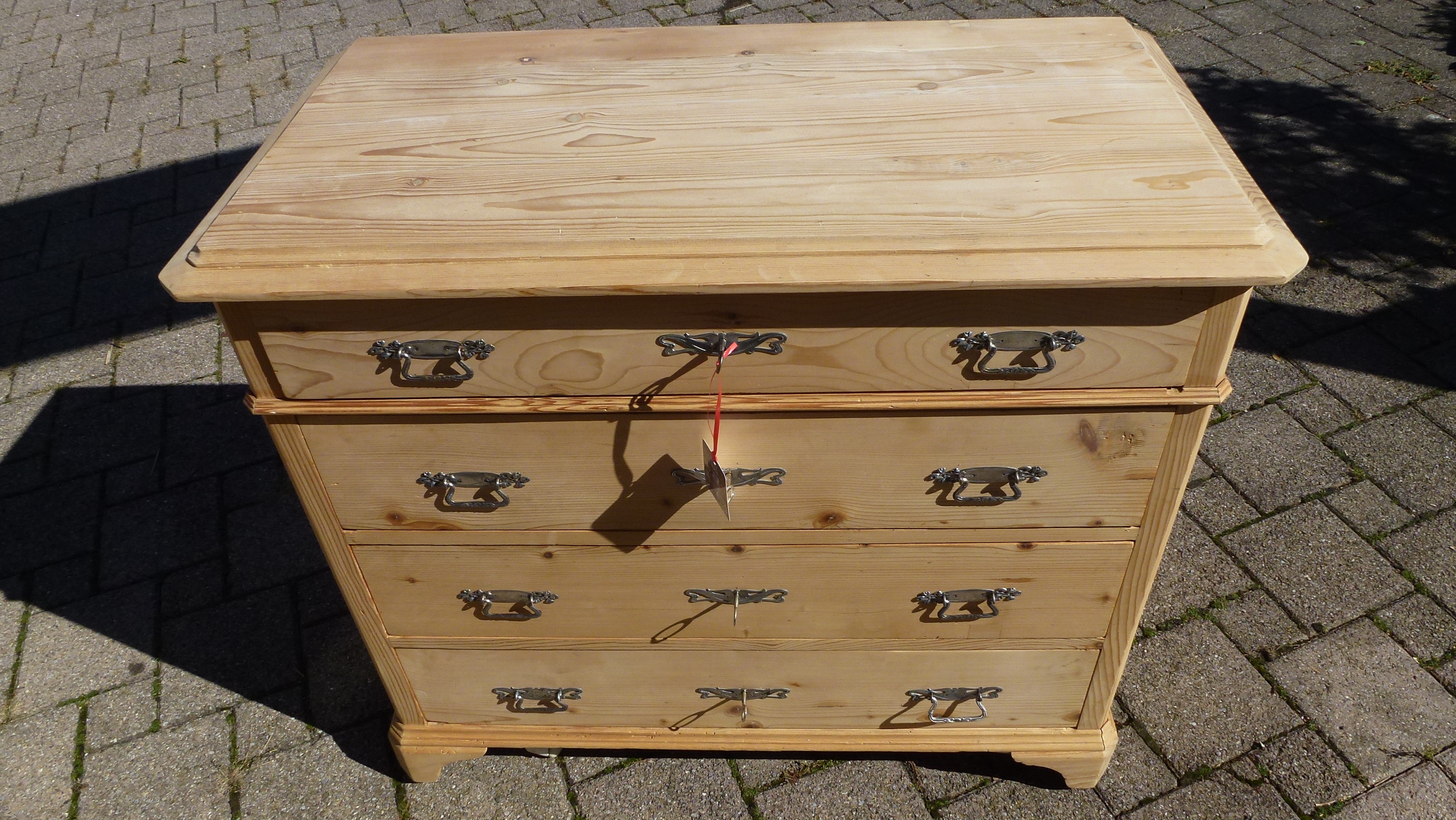 Schubladenlauflisten und Züge sowie Streichlisten wurden ersetzt, sie waren praktisch durchgelaufen. Das Möbel wurde gelaugt, repariert und vorgeschliffen. Die Beschläge wurden nur provisorisch montiert, da möglicherweise eine Oberflächenbehandlung passend zu den vorhandenen Möbeln ausgeführt werden muss. Die Schlösser fehlten und mussten durch Andere ersetzt werden. Die Schlüssel wurden eingepasst, aber noch keine alten Raiden auf die Schlüssel montiert.