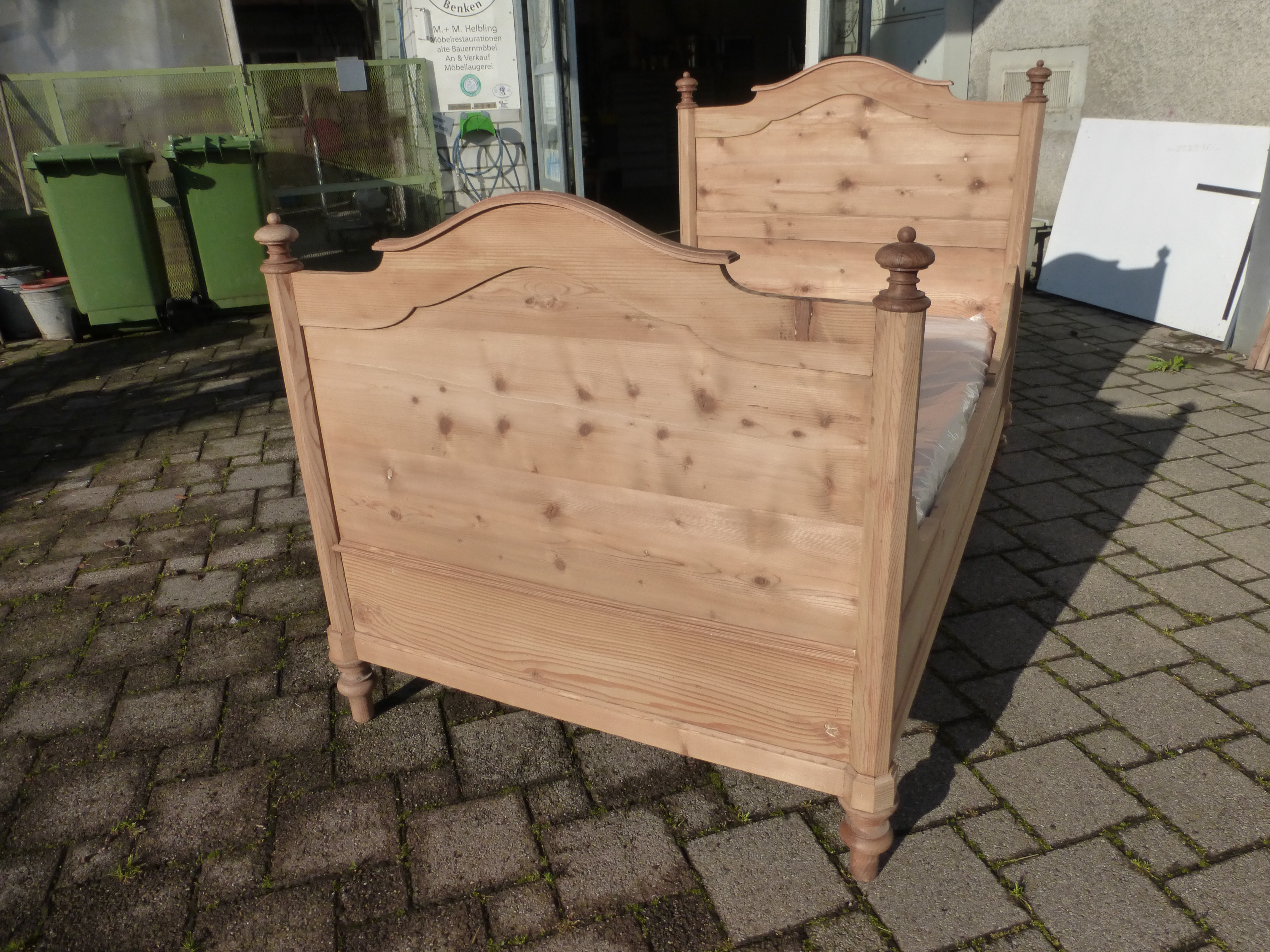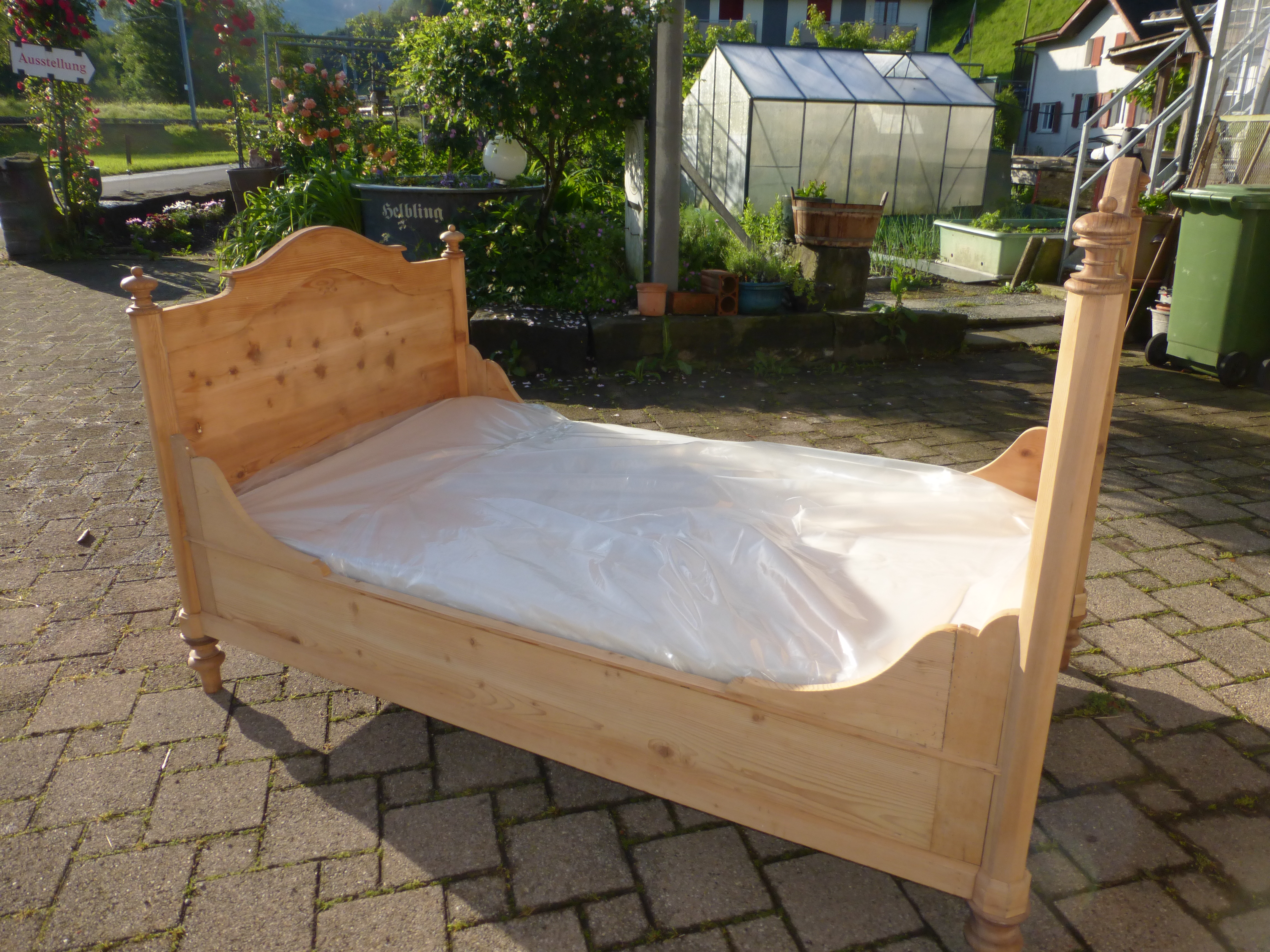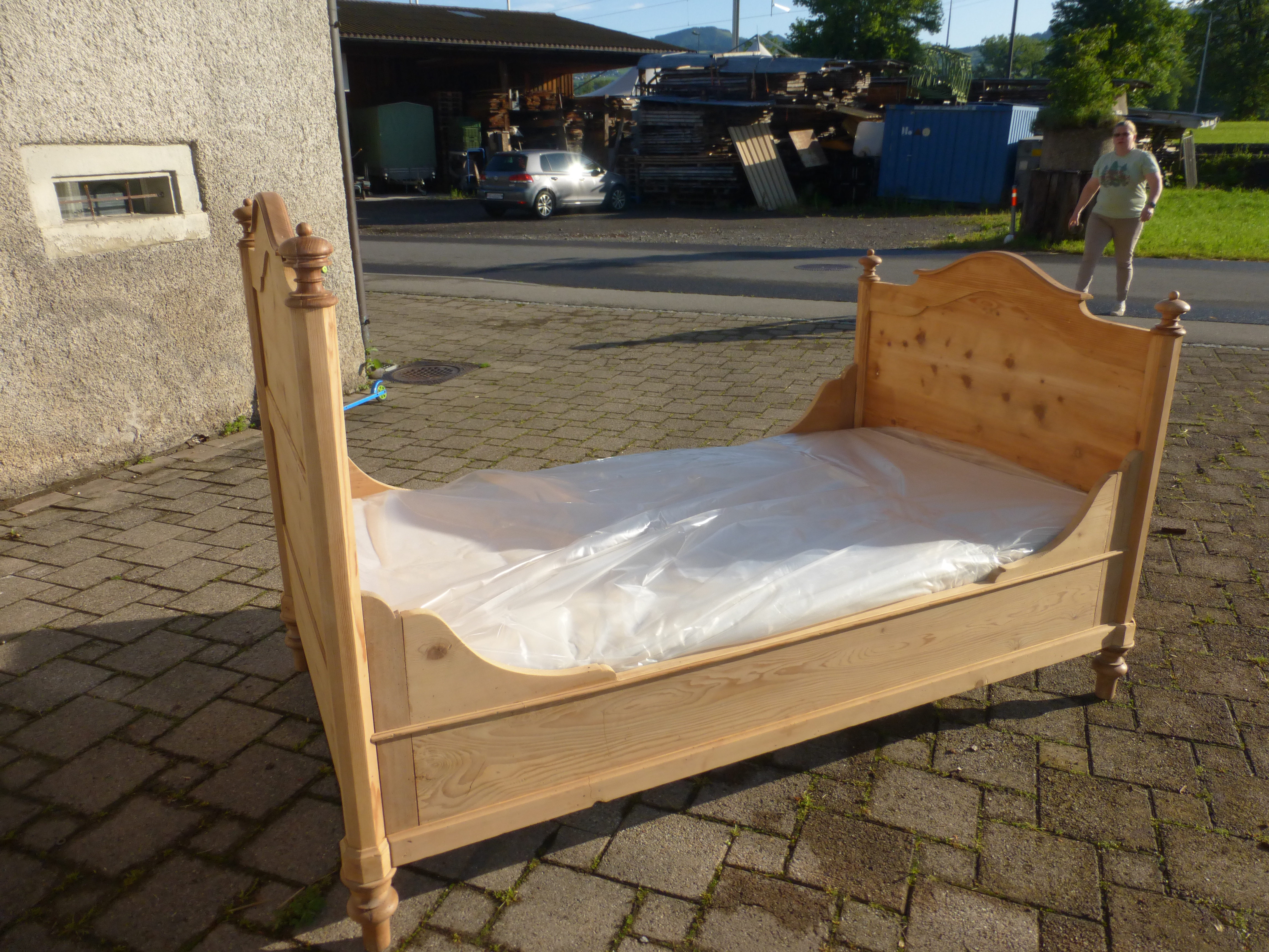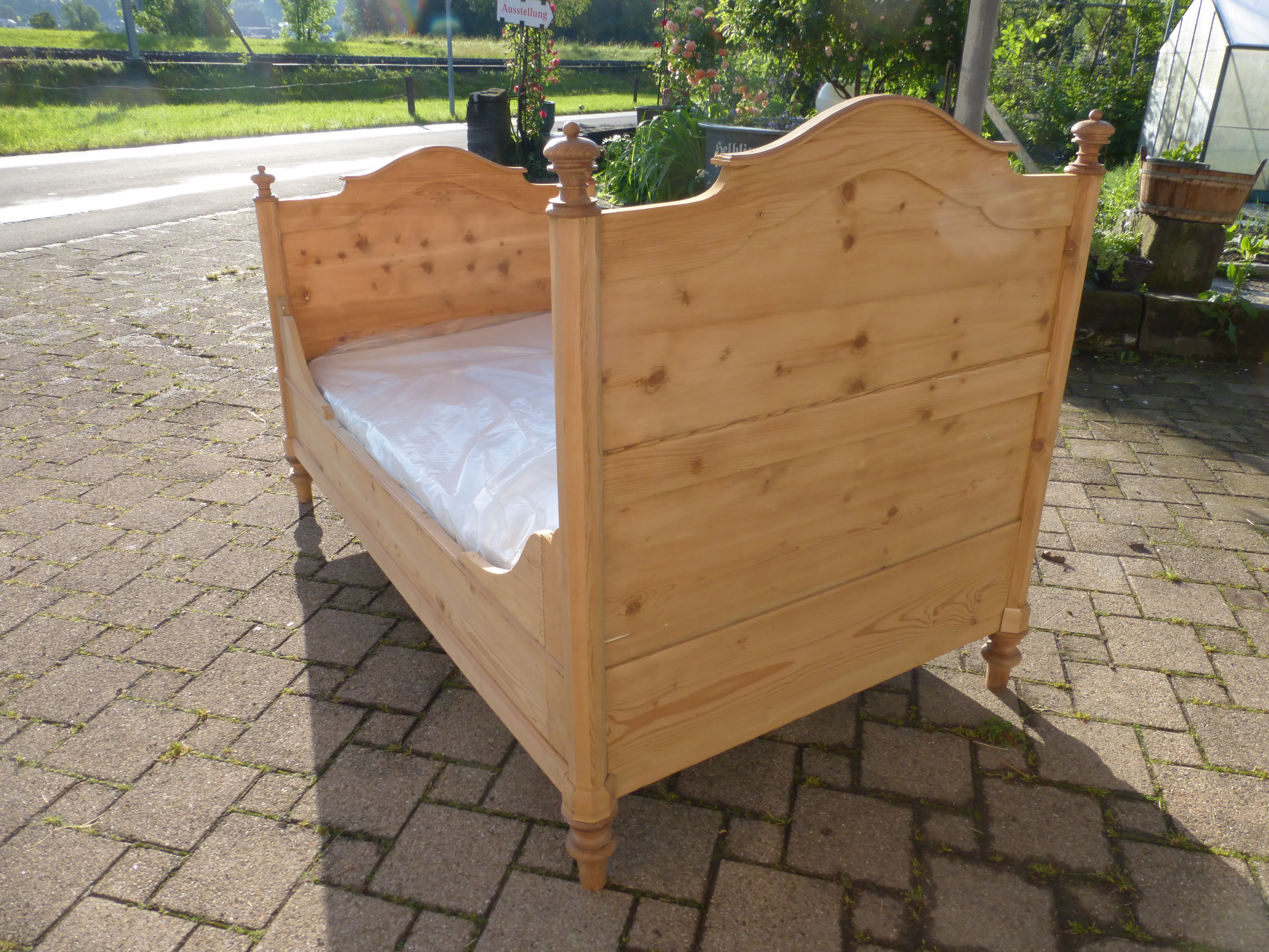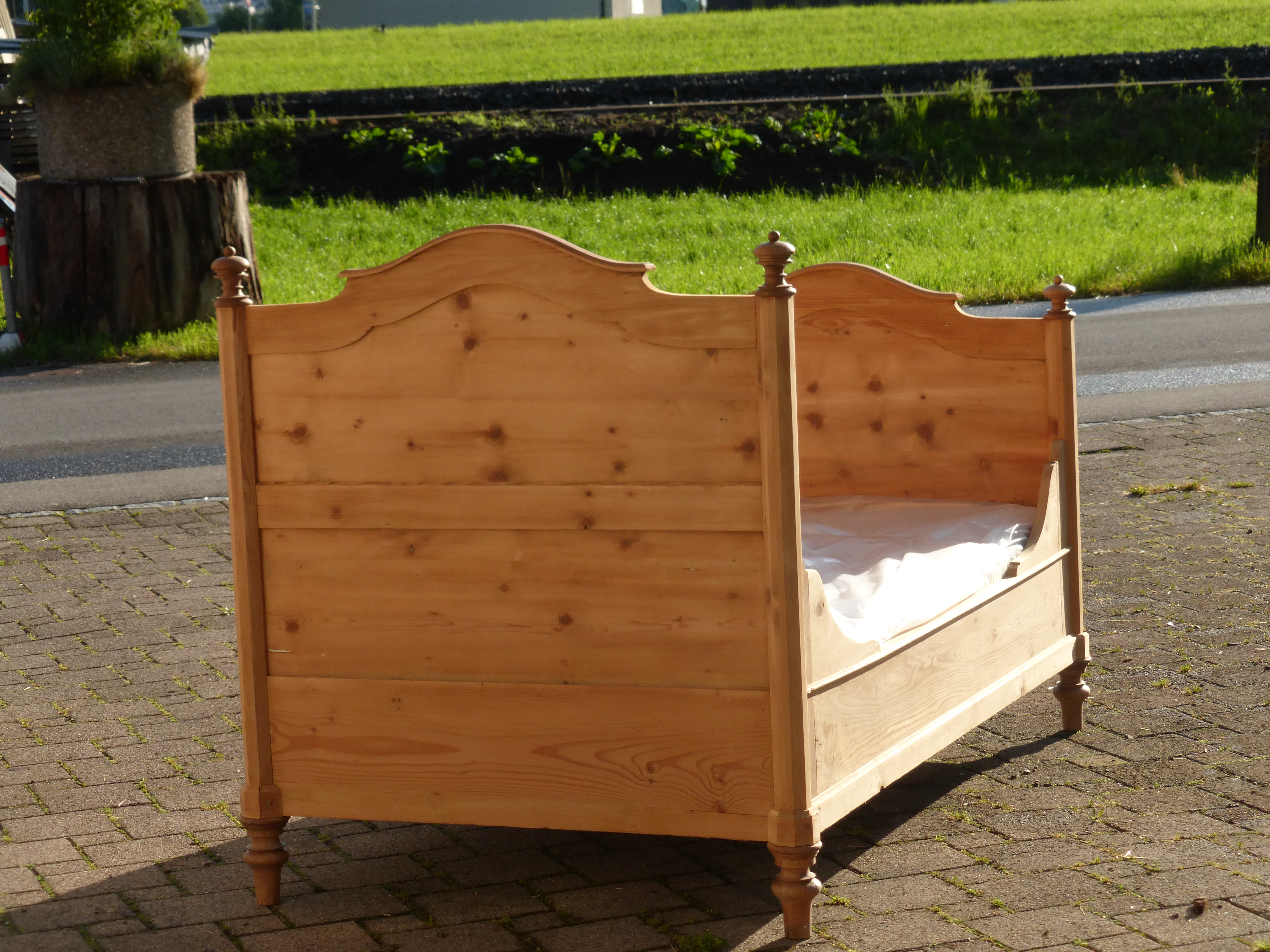 extrabreites Tannenbett mit neuerem Lattenrost und sauberer Matratze Matratzenmass 180 x 95 cm. Das Holz wurde geschliffen, ist aber ohne Oberflächenbehandlung, also noch roh.