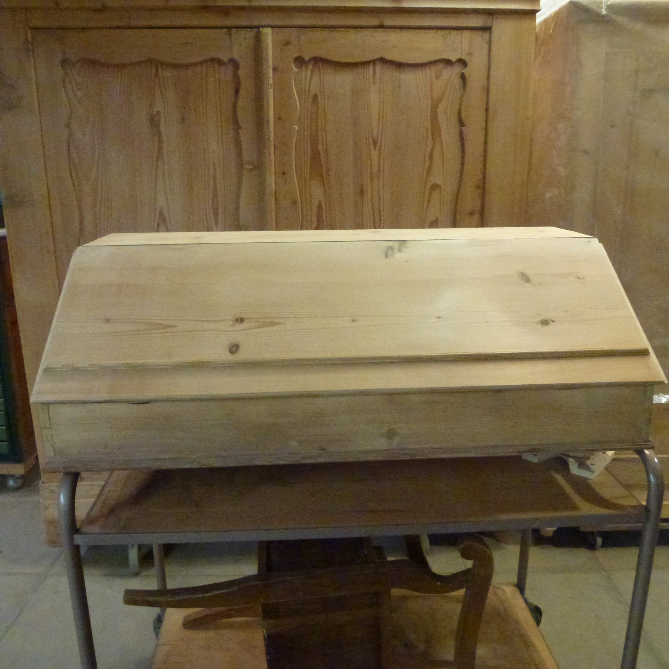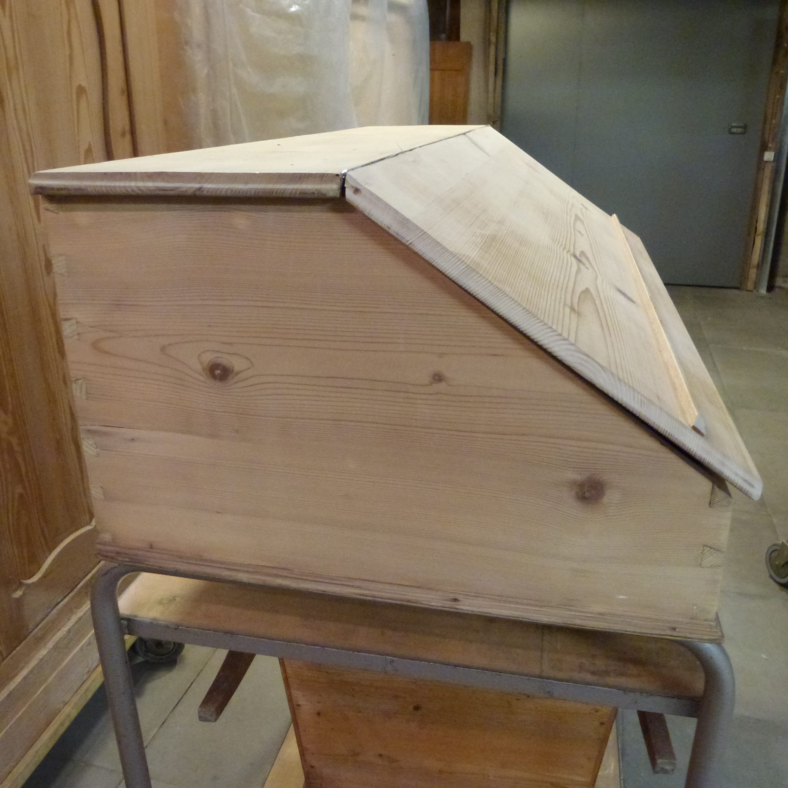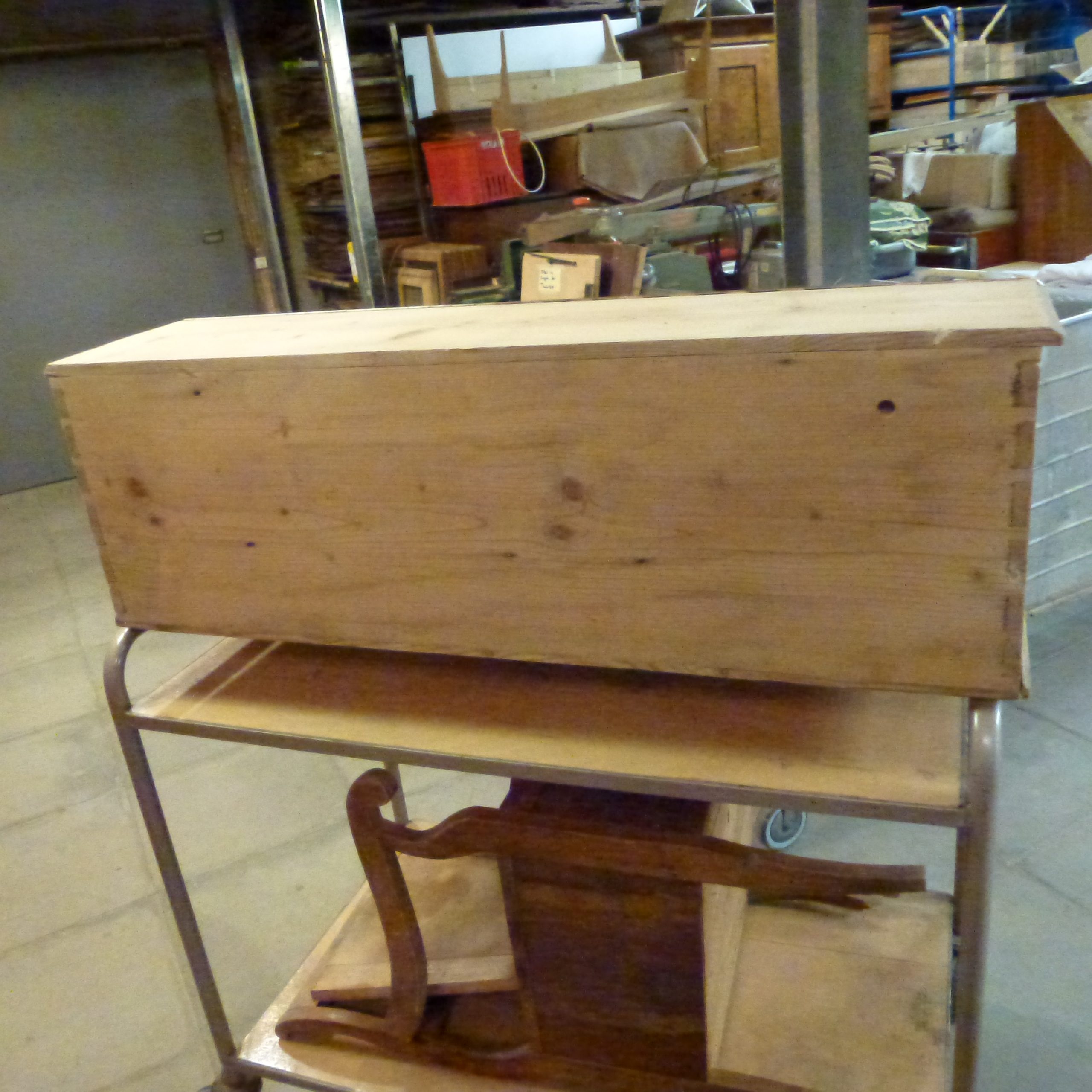 In Fichte, abgelaugt, repariert und geschliffen. Noch ohne jergendwelche Oberflächenbehandlung.