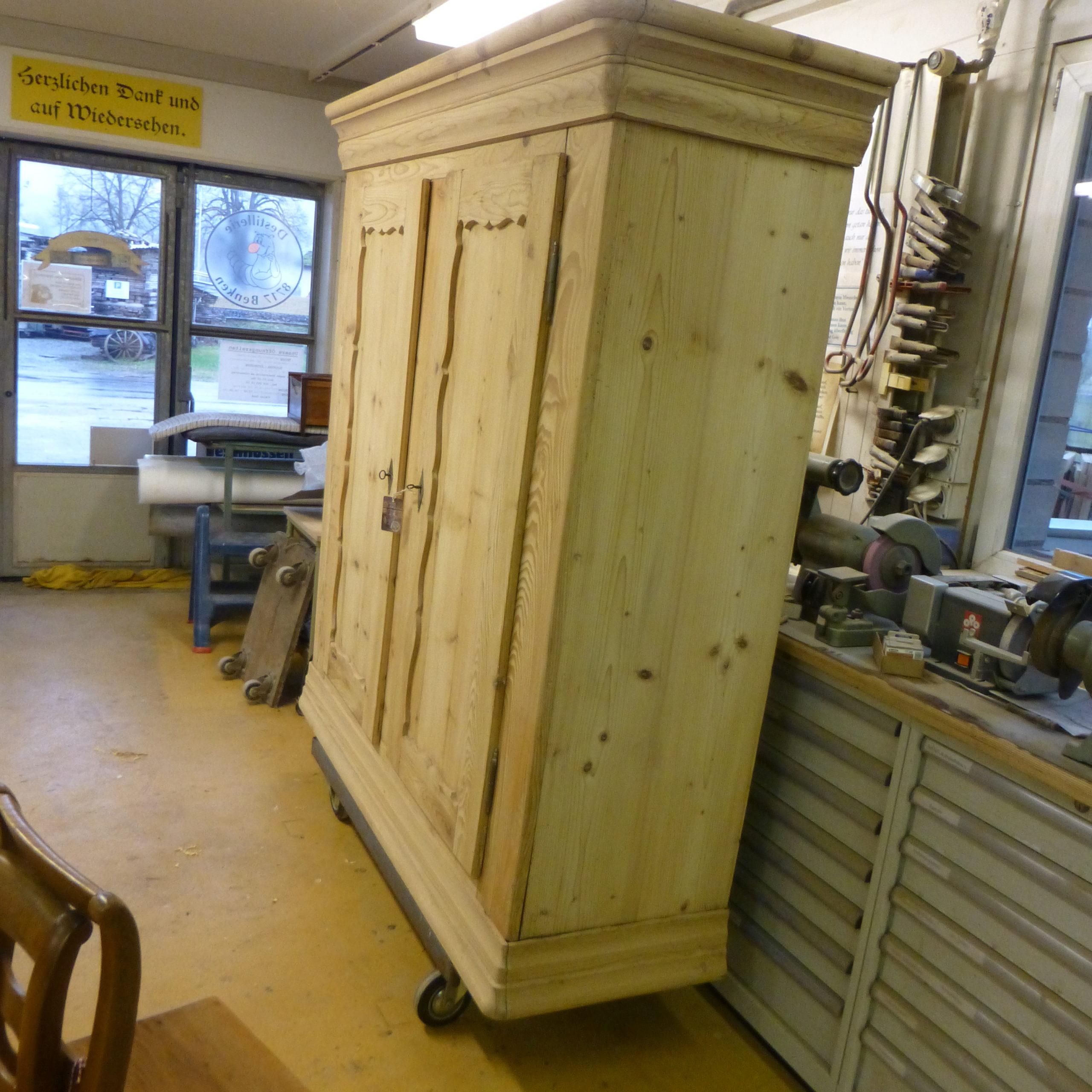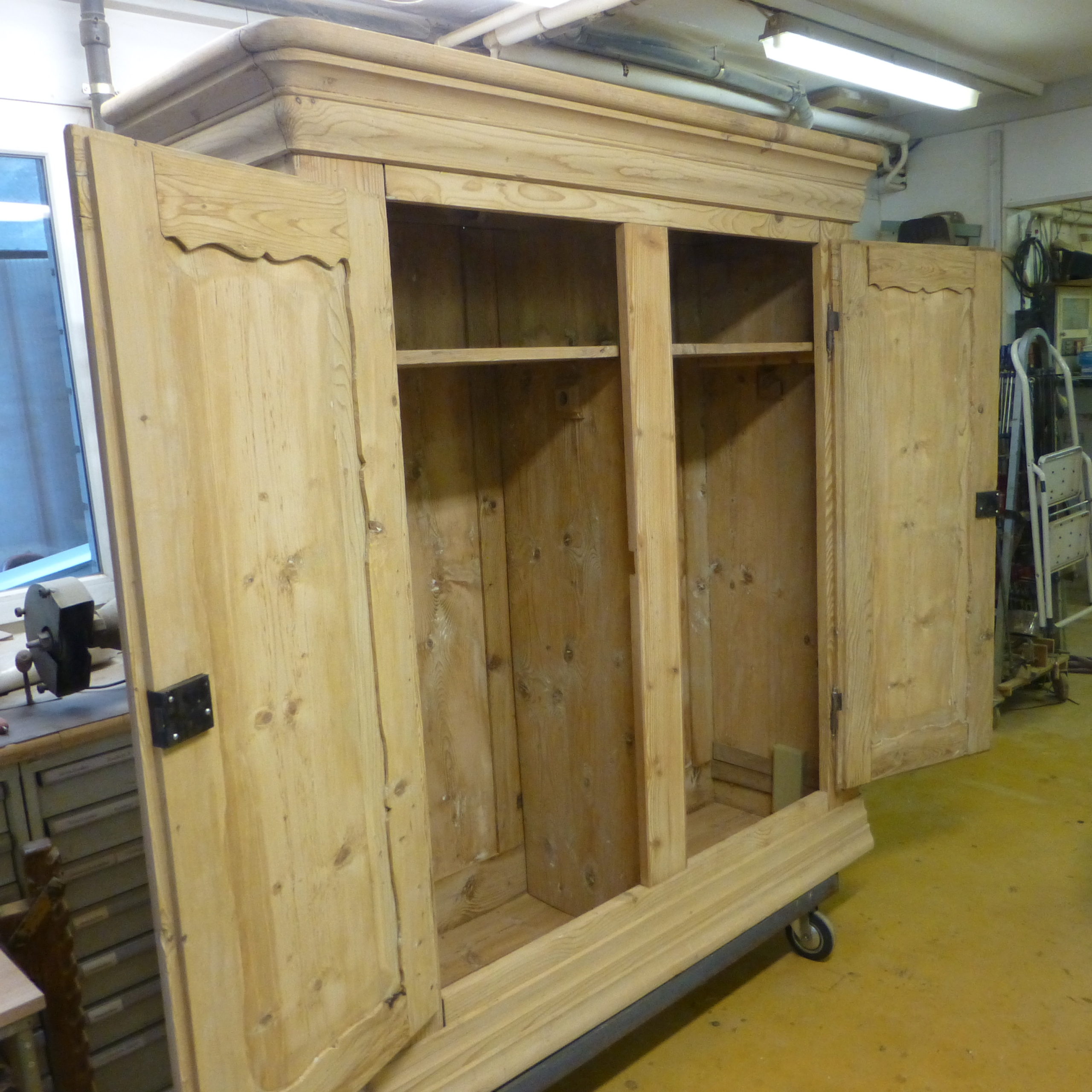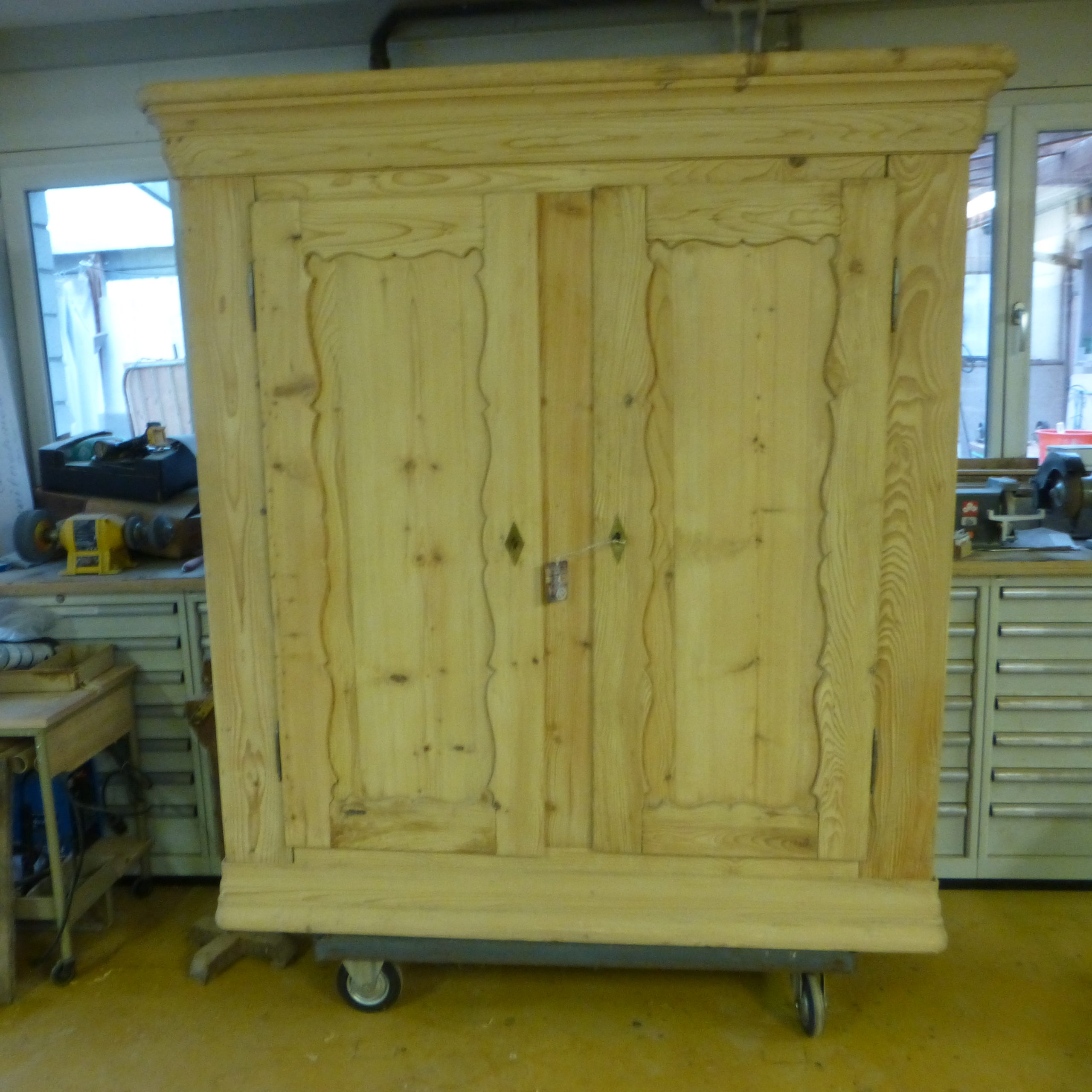 Dieser einfach zerlegbare Schrank wurde gelaugt, repariert und geschliffen. Innen wurden einige wildwüchsige Stellen zu einem früheren Zeitpunkt mit einer Kalk- oder Gipsmasse gespachtelt.