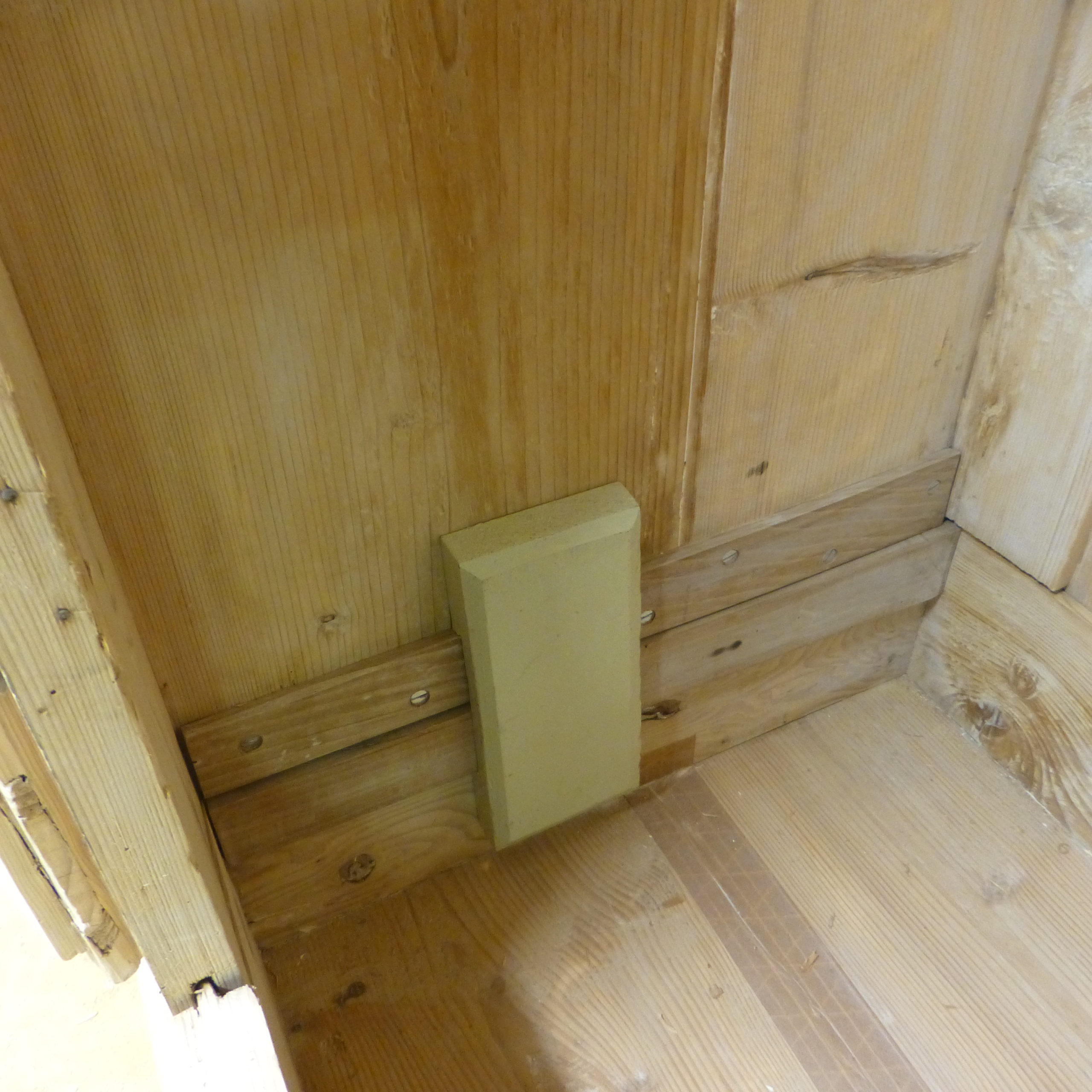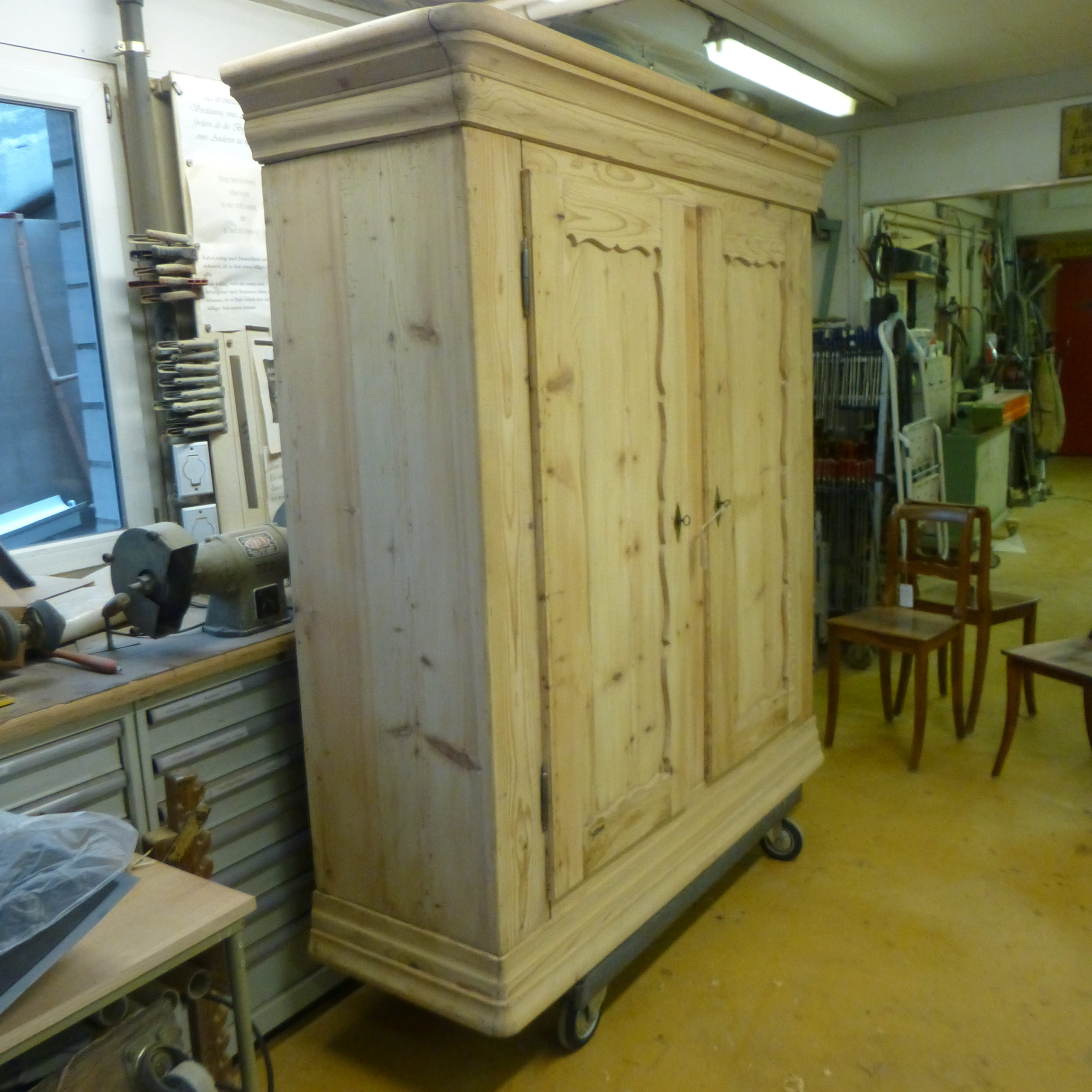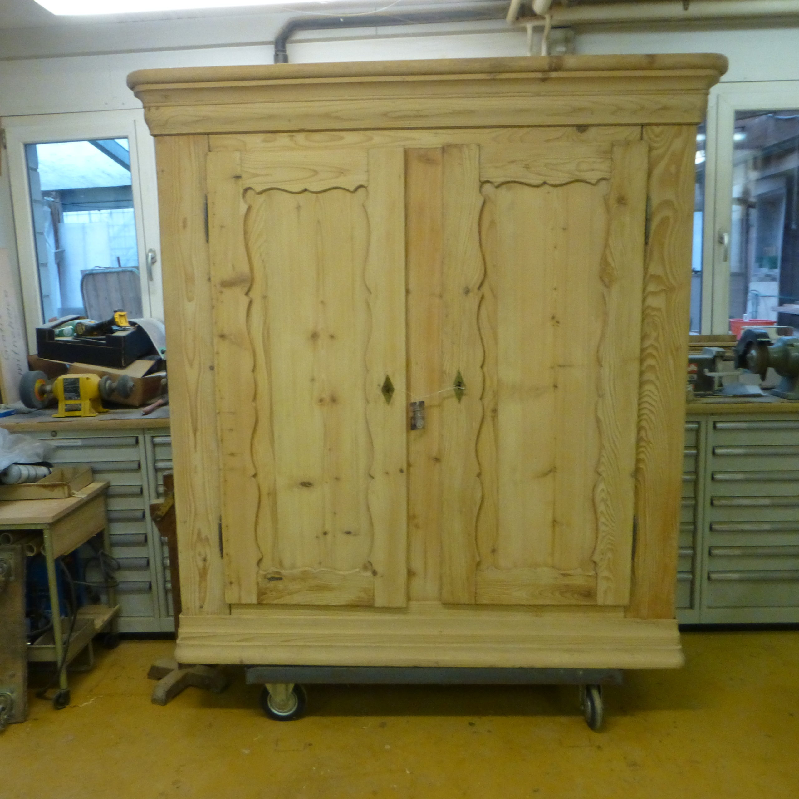 Dieser einfach zerlegbare Schrank wurde gelaugt, repariert und geschliffen. Innen wurden einige wildwüchsige Stellen zu einem früheren Zeitpunkt mit einer Kalk- oder Gipsmasse gespachtelt.