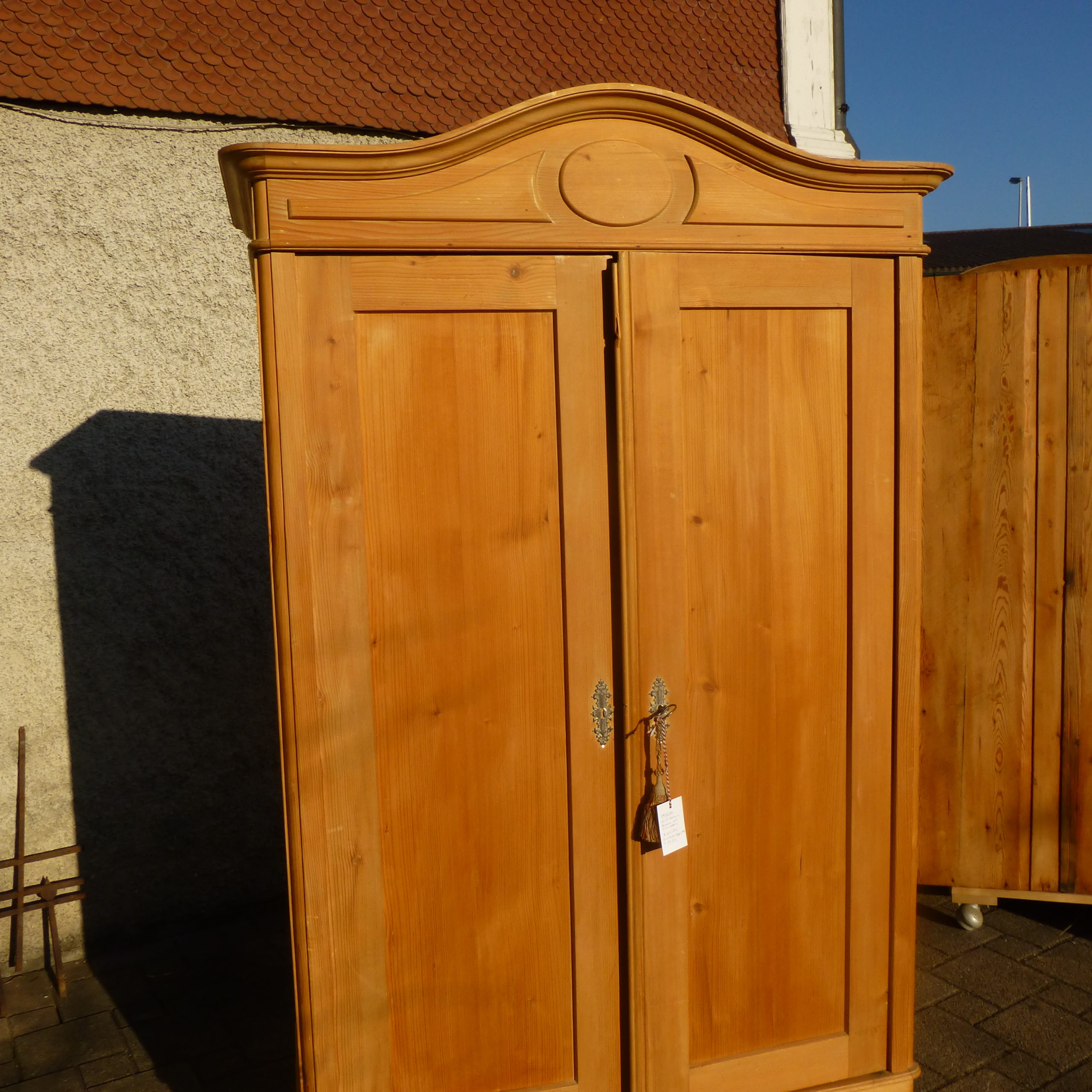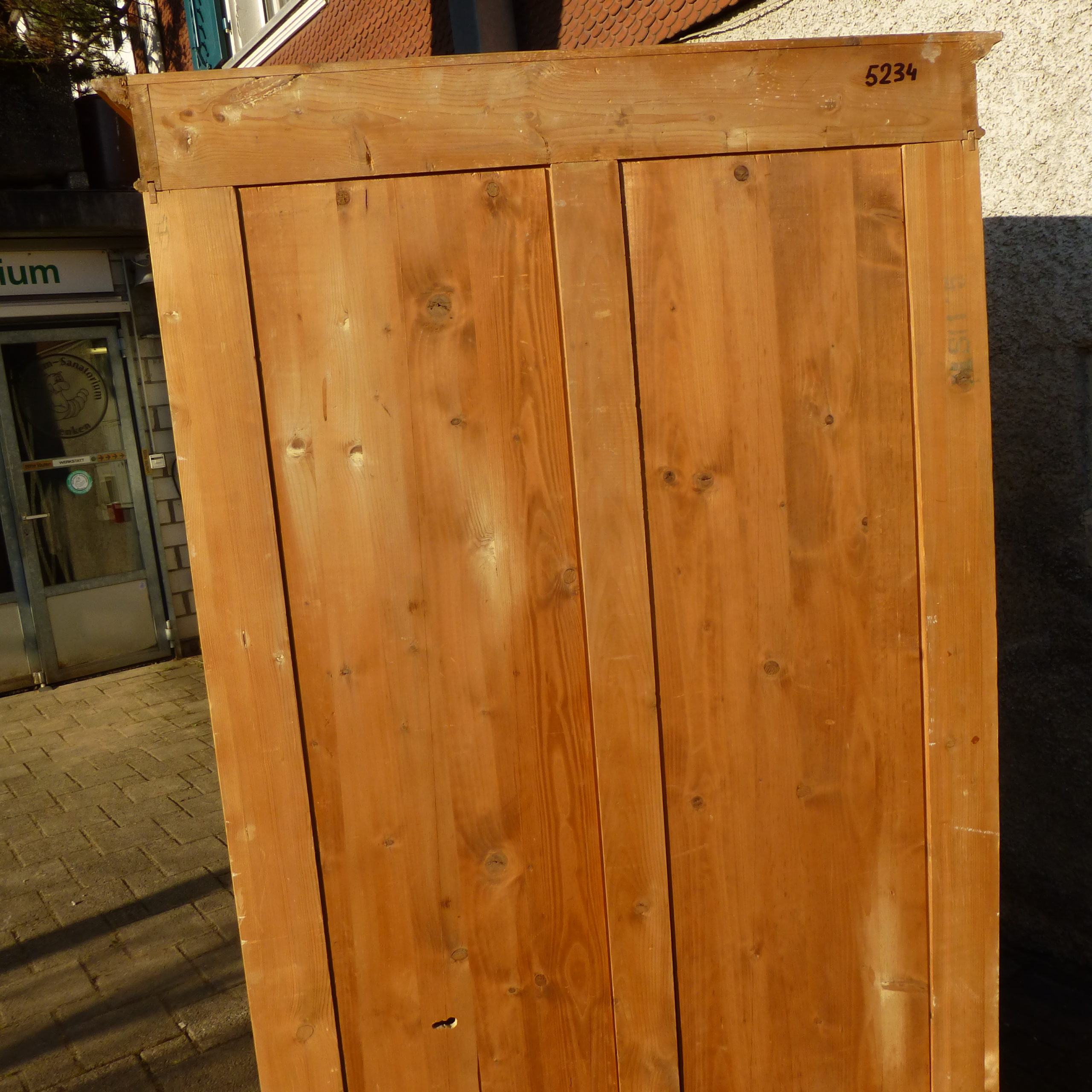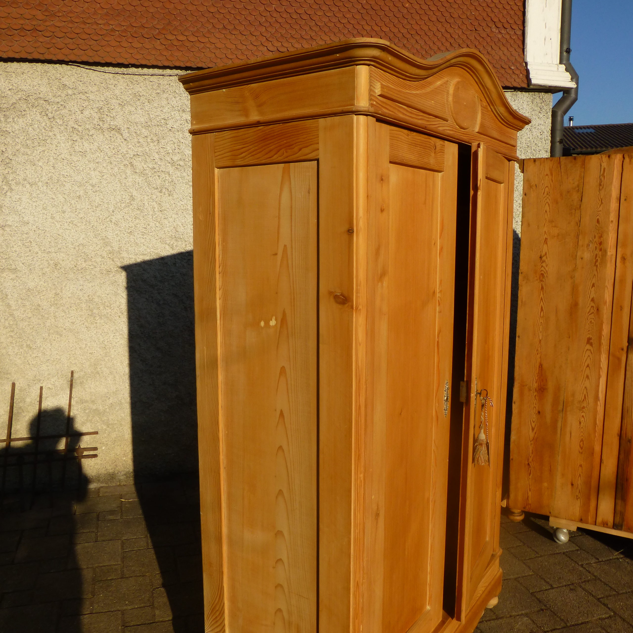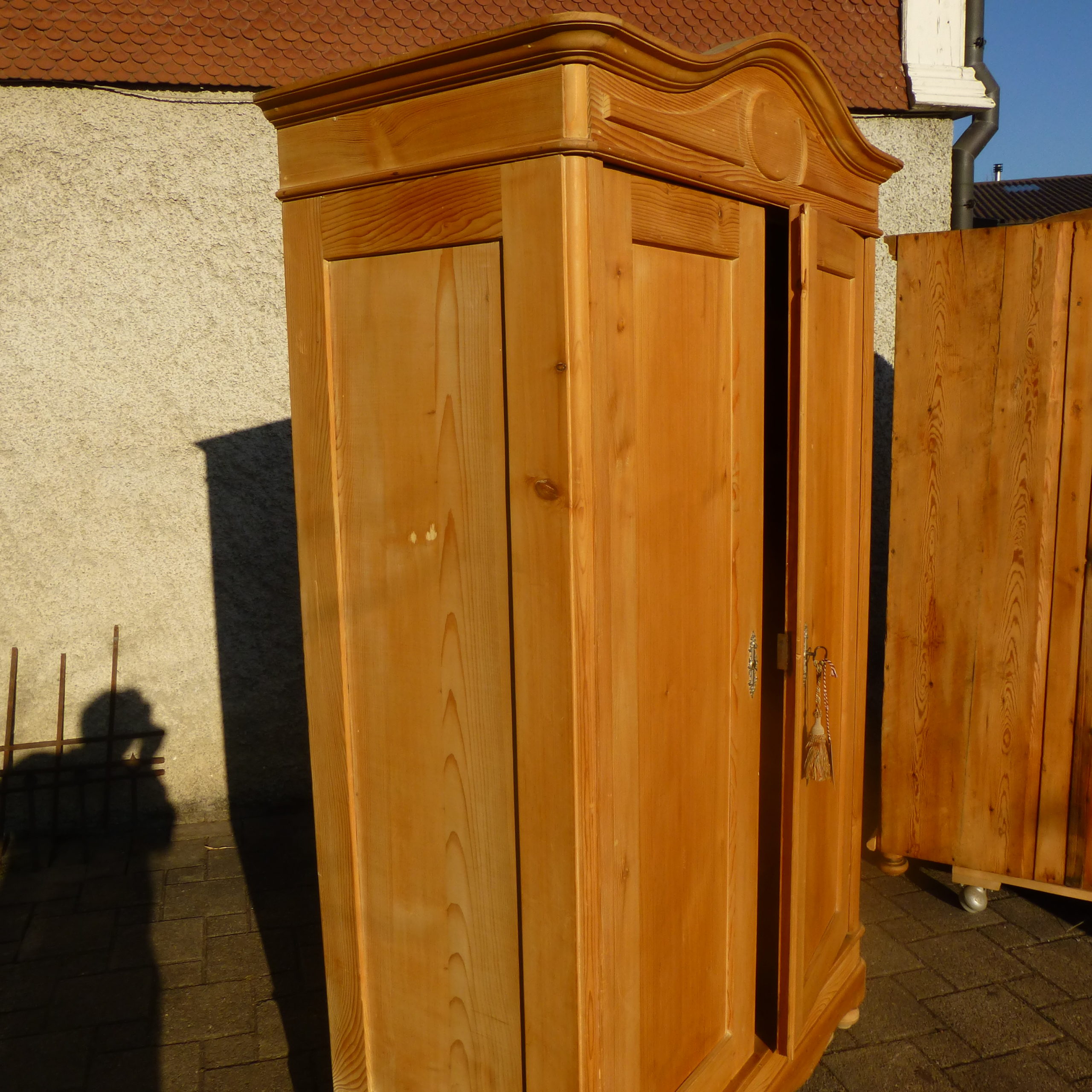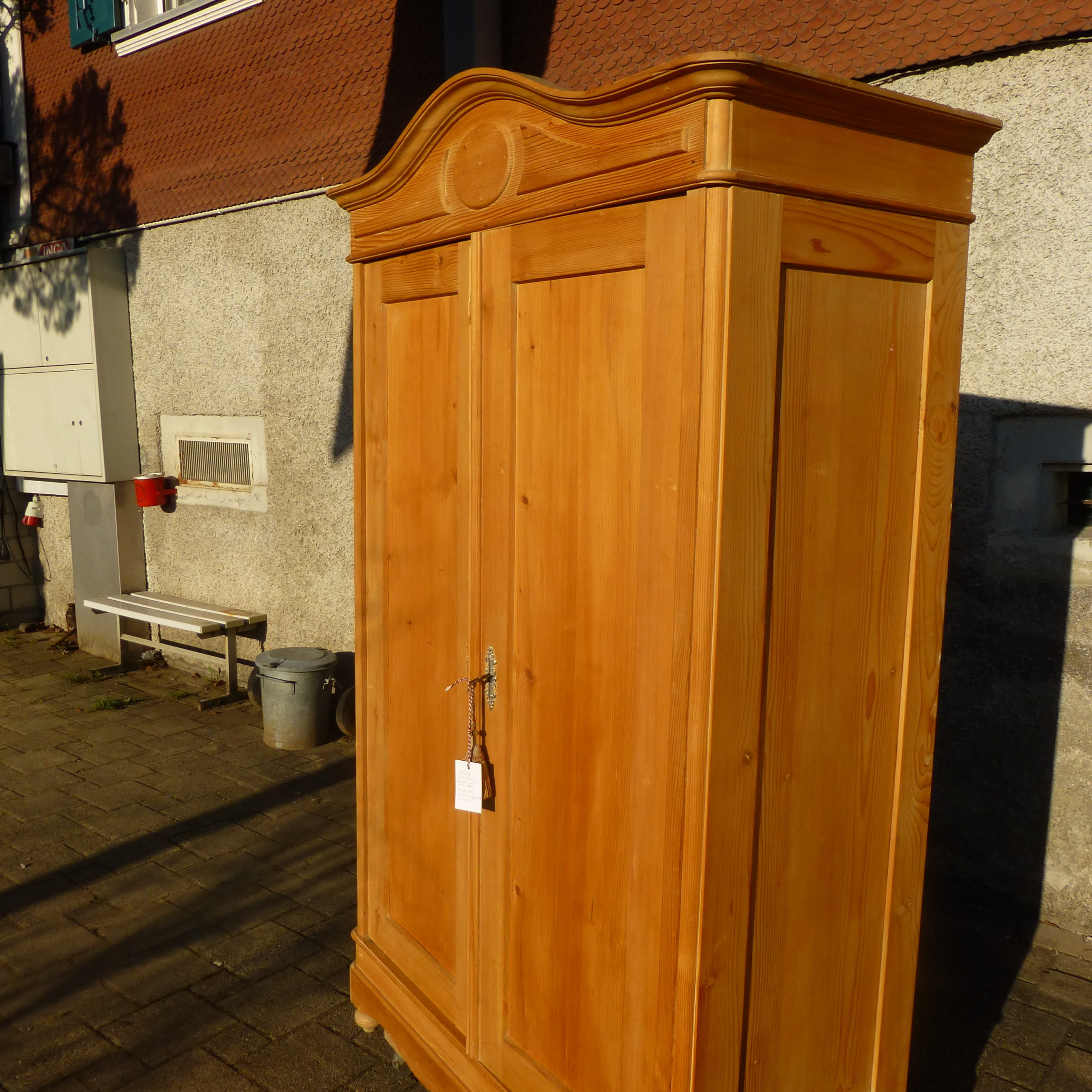 Das Innenleben passt nicht ganz zusammen und muss entsprechend dem neuen Besitzer angepasst oder teilweise erstzt werden. Dieser Schrank ist komplett zerlegbar und auch in Wohnungen mit Bodenheizungen geeignet. An den Zwiebelfüssen sind Filze aufgeleimt. Dieser Schrank ist heller als auf den Bildern, da er in der Zwischenzeit komplett Überschliffen wurde.