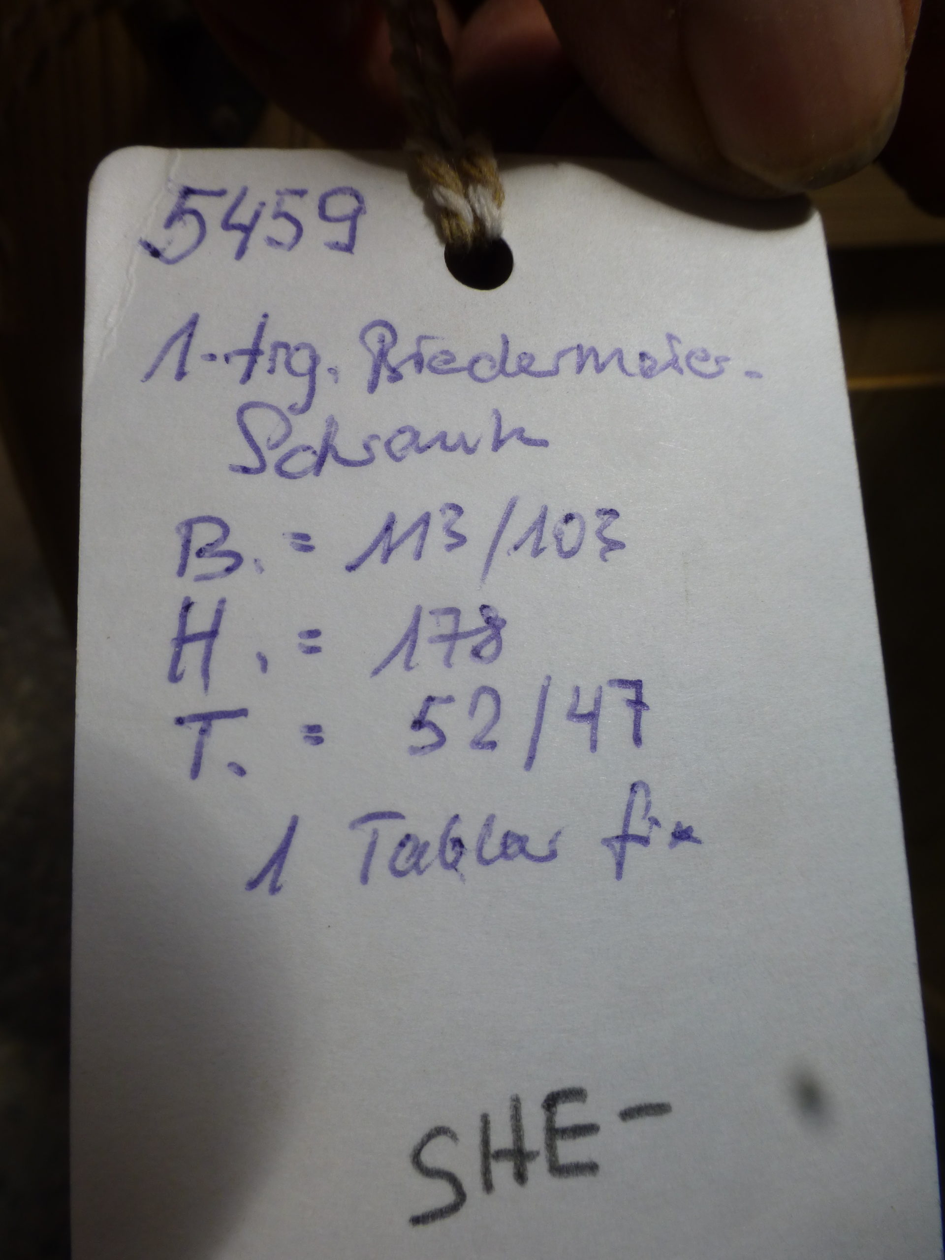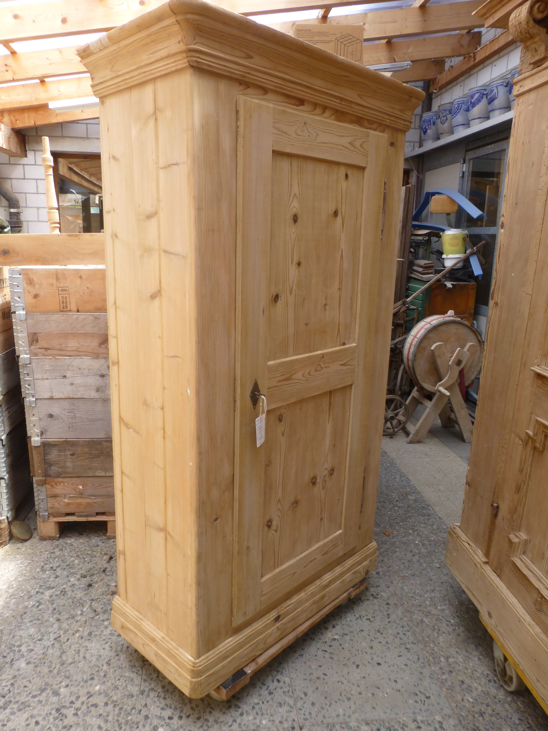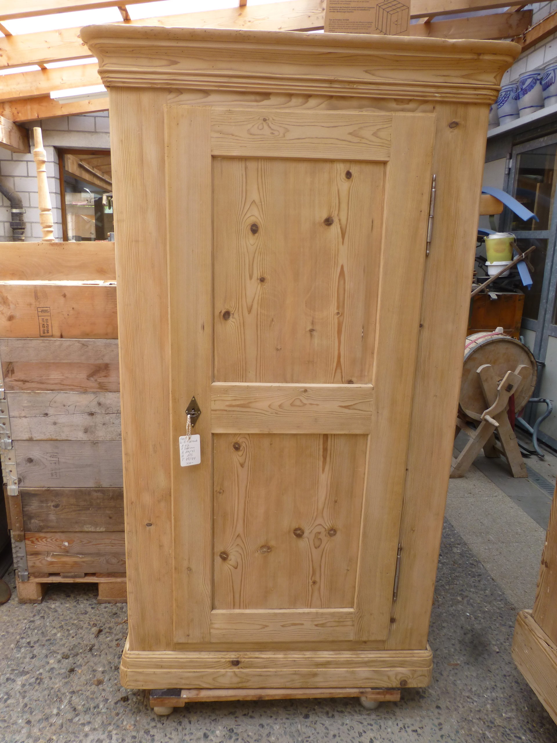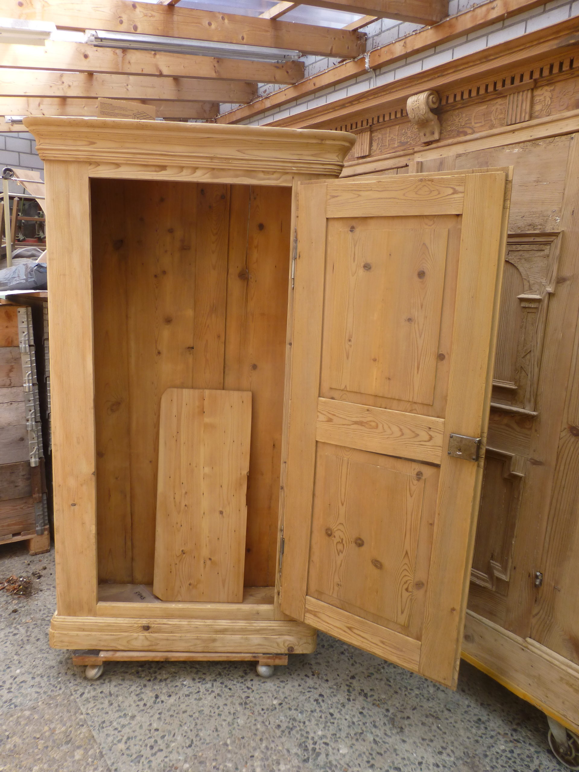 Gelaugt, techn. getrocknet und repariert. Mit 100 bis 120 er Korn geschliffen, aber roh (unbehandeltes Naturholz). Muss vor Ablieferung nochmals fein überarbeitet und den Wünschen entsprechend fertiggestellt werden.